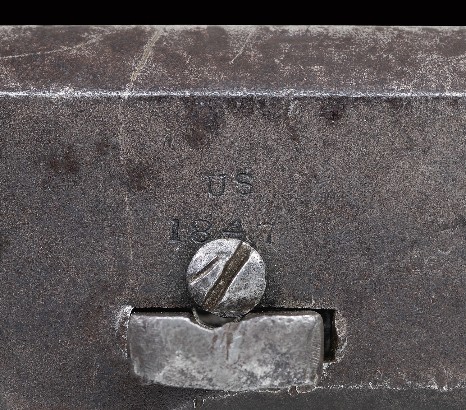 This revolver is honest survivor that had barrel shortened to dragoon length during its period of use. It is pictured in the 2003 “Parade of Walkers” and has good collection history. The original Walker loading arm has been altered by brazed 1.5” dragoon style end with spring latch seen on other Walkers for continued use. The barrel is cut to 7 3/8” with small brass inset front sight. This is a very attractive Walker with the best markings and “as found” appearance from it time of use in the west until discovered by Montana collector John Fox about 40 years ago.