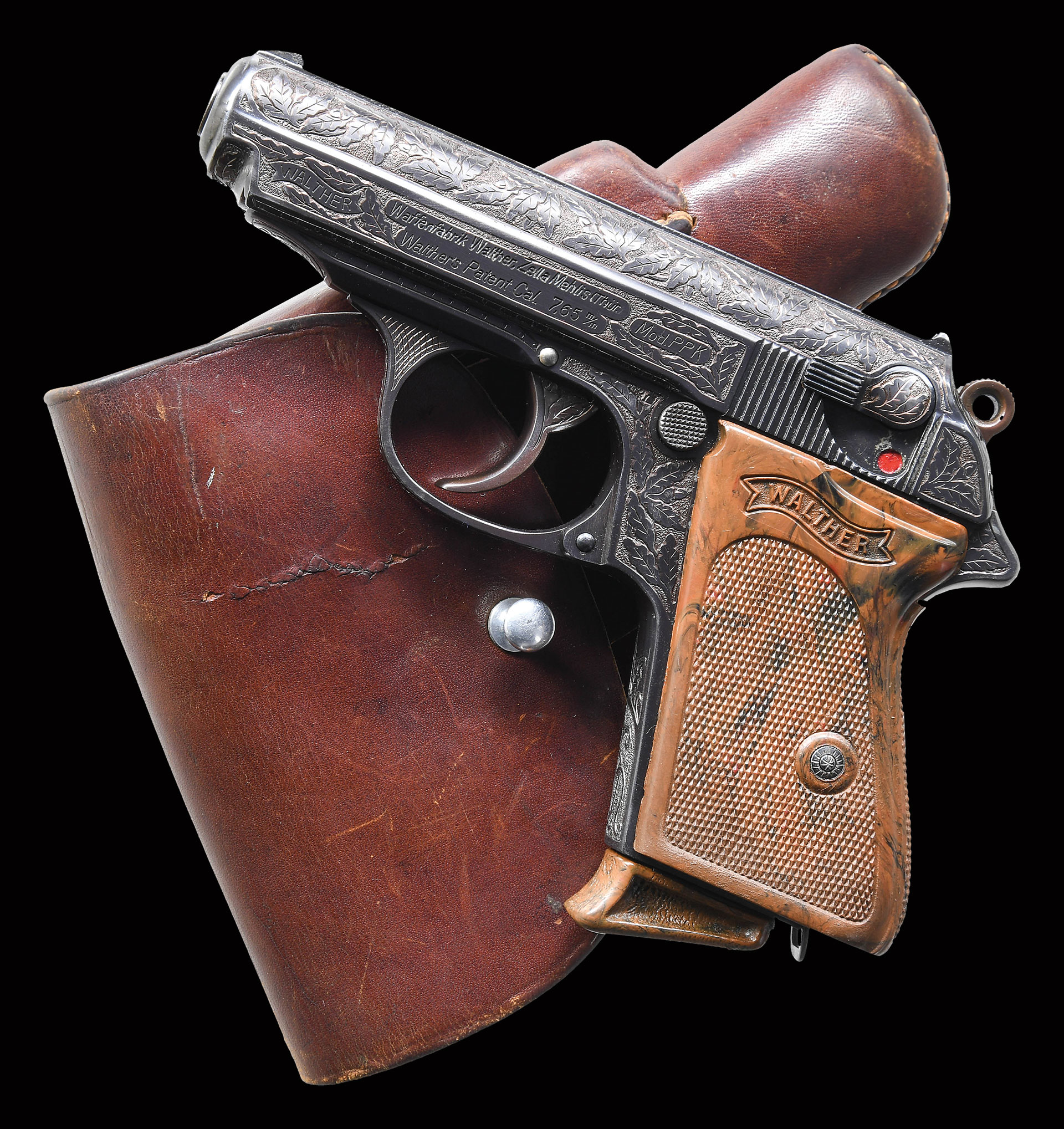 Model PPK semi-automatic pistol mfg. by Walther circa. 1934. Left side of the slide is marked with the Walther banner logo, followed by markings stipulating Walther’s mfg. information, as well as the model and cal. designations. Right side of the frame (on chamber), slide, and bbl. exhibit a German Crown/N commercial nitro proof. Frame and slide feature near full coverage oak leaf engraved panels on a stippled background. Front grip strap is engraved with what appears to be an intertwined “hh” monogram. Metal components exhibit a nicely reapplied blue finish overall, with the hammer having a plum appearance. Frame is mounted with a 1-piece Walther banner mottled brown checkered synthetic grip. Slide features a grooved matte rib with an integral blade front sight and U-notch rear sight. Interior of slide is etched “222” parallel to the ejection port, seemingly above another number. MAGS: 2 blued 7-rd. 1 mag. with seemingly contemporarily engraved floorplate, the other with what appears to be a reproduction mottled brown grip extension. UNATTACHED ACCESSORIES: brown leather holster marked “D.R.G.M.” above the Akah logo on the break away flap. This lot is also accompanied by an original letter dated “13 MARCH 1944” requesting a promotion of Captain Rudolf Puchinger of the Luftwaffe and photos, presumably of Puchinger. Research indicates that Rudolf Puchinger was shot down in a JU 188 A-2 by a Mosquito of the 264th Squadron during a nighttime sortie over the Orne Estuary in Normandy on June 13th of 1944. Document and photos are housed within a period black leather folder that features a gold pre-party eagle on the cover.