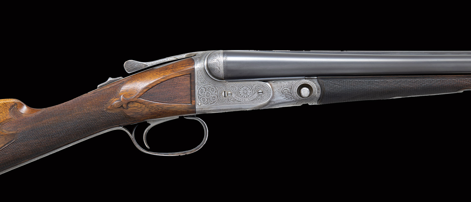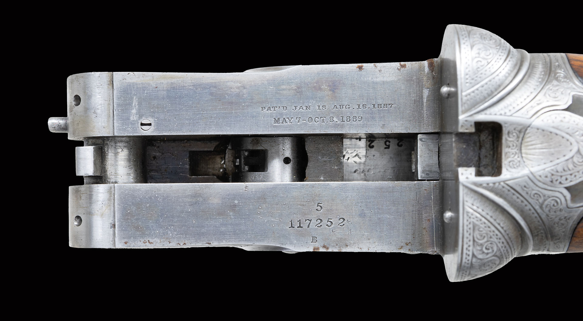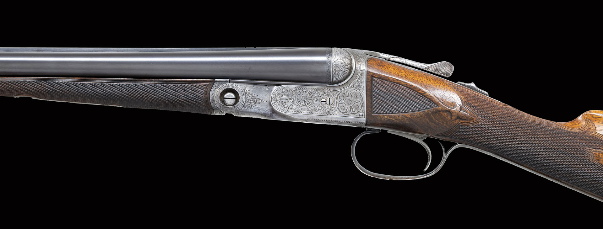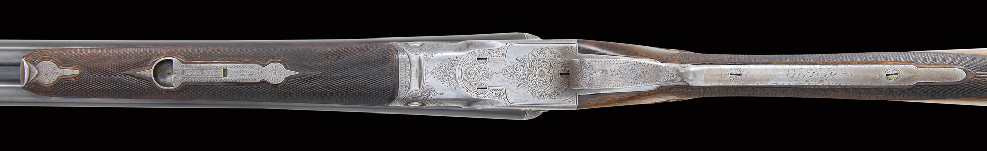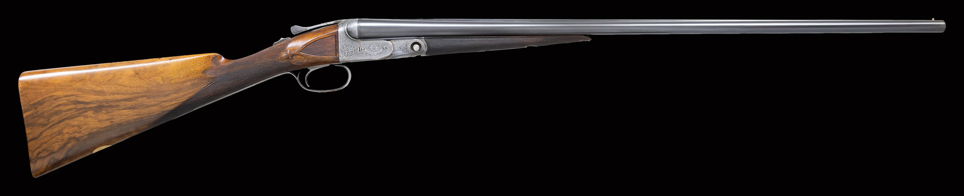 Factory records indicate that this gun was made in 1903 with 28″ 20 Ga. Damascus barrels. Stock was straight grip and gun had neither ejectors or single trigger. Gun presently is fitted with 27-7/8″ Acme steel barrels in 28 Ga. and features automatic ejectors and a single trigger. The barrels are marked with Parker name and Meriden Conn address along with “Acme Steel” (first offered around 1905) on typical concave matted rib. Barrel flats are stamped with weight, steel info, grade and patent dates as well as “2” frame size “0” and “28” are on rear lump. Case hardened action with non-automatic safety and unmarked single non-selective trigger has all correct markings on watertable and is very nicely filed in grade B manner with beads around fences and chevron on top lever. Standard engraving for B grade guns consists of dogs and birds within a field of scroll. Engraving on this gun is obviously special ordered and consists of flower blossoms in circles on sides of action framed by an interplay of nicely cut scroll within line and geometric borders. Trigger plate is engraved with a pyramid of more blooms amid more very well cut and shaded scroll. “PARKER BROS.” is on arched ribbon on both sides of action. Trigger guard with scroll on bow has S# on tang. Straight grip buttstock made of very nicely veined and lightly figured European walnut measures 13-3/8″ over checkered wood butt. Stock features typical B grade grip checkering with fleur-de-lis extension into comb, inset checkered side panels and fleur-de-lis drop points. A vacant gold oval is on toeline attached with tacks in correct Parker fashion. Matching splinter ejector forend with nicely filed steel tip is near fully checkered. Patent dates are engraved on typical release and stamped on iron. MEASUREMENTS: BBLS: Bore Diameter: L .555 R .555. Restriction: L .025 (Mod). R .005 (IC). Wall thickness: L .034. R .032. STOCK: DAH: 2-1/2″. DAC: 1-5/8″. CAST: about 1/2′ off. LOP: 13-3/8″. WEIGHT: 6 lb. 6 oz. UNATTACHED ACCESSORIES: gun is housed in aluminum motor type case by Dan Walter Cases which is lined in red velvet. Case contains a pair of 28 Ga. A-Zoom snap caps, a pair of plastic 20 Ga. snap caps, a 20 Ga. Morocco leather hand guard and cleaning equipment under lift out tray.