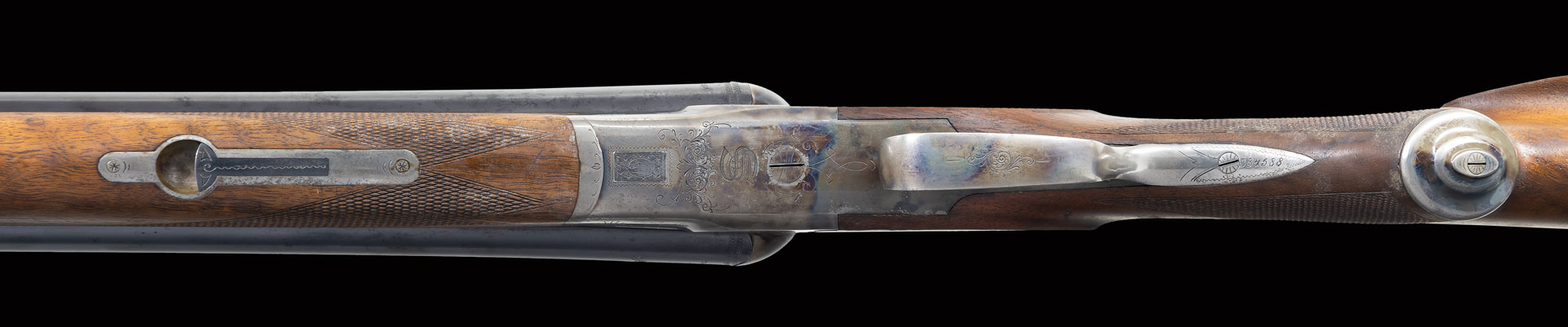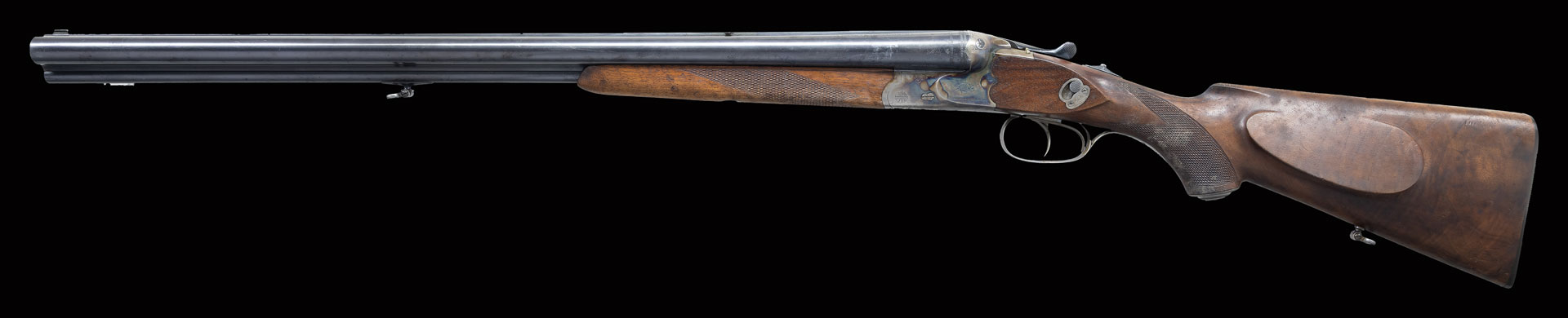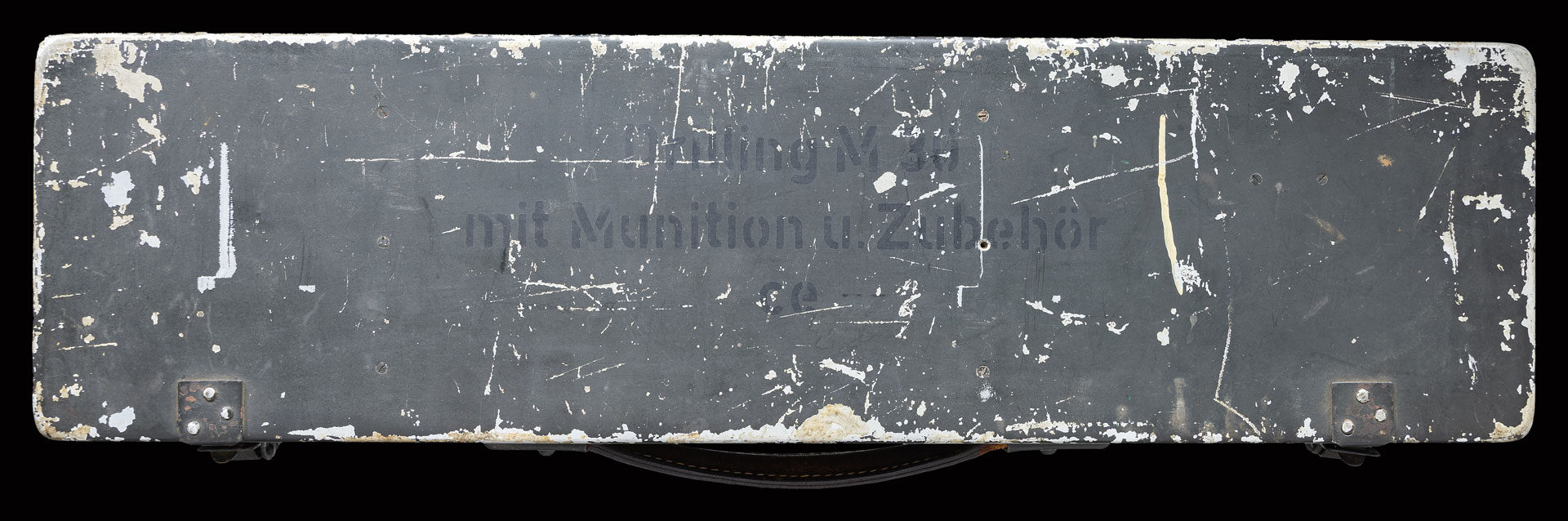 The German Luftwaffe took good care of its flight crews and provided this high quality combination gun as a survival weapon in case of a crash. A good number were brought to America by returning servicemen after WWII. This very fine “as found” example is of standard configuration with 25-5/8″ barrel set fitted with full length matted rib holding pop up rear and silver bead front sights. Rifle caliber is engraved on milled out portion of rib. Krupp Steel information is on tops of barrels and maker’s name and address are around breech ends. A Luftwaffe eagle is stamped on side of right barrel. Barrel flats are stamped with February 1941 commercial nitro proofs for 12 Ga. 65mm chambers and 9.3x74R rifle cartridge. Bottom barrel is also stamped with Sauer SSU logo and Waffenanpt LZA (eagle) depot “2” is on bottom of rear lump. Sauer caveman logo is on bottom of front lump. Case hardened blitz action with side safety, rifle selector on top tang, pin cocking indicators on top, cross bolt third fastener, side clips and double triggers (front set) is lightly scroll engraved. Both sides are marked “JP SAUER & SOHN, SUHL”. Bottom of action is marked with “SSU” logo. Rear of top tang is engraved “W.St.”. Case hardened steel trigger guard with some scroll on bow has S# on tang. Steel capped pistol grip buttstock made of very dense, nicely stump figured European walnut measures 14″ over original “SSU” logo hard rubber buttplate. Stock features small right hand cheekpiece, sling loop matching that found of bottom of barrel, and point pattern checkering at grip. Right side of stock near butt is lightly stamped with Luftwaffe flying eagle holding a swastika. Matching splinter forend has Deeley release. MEASUREMENTS: BBLS: Bore Diameter: L .720. R .720. Restriction: L .33 (full). R .029 (Imod). Wall thickness: L .030. R .029. STOCK: DAH: 2-1/2″. DAC: 1-1/2″. CAST: about 1/4″ off. LOP: 14″. WEIGHT: 7 lb. 8 oz. UNATTACHED ACCESSORIES: gun is housed in it’s original field gray painted aluminum case with two latch closure and leather strap handle. Top of case is black painted “Drilling M30” “mit Muniton u. Zubehor” “ce”. Interior with felt gaskets and wood partitions has list of original contents stenciled on left side of lid. Case presently contains small brown instruction book marked “Drilling M30” “Ausgabe Juni 1941”.