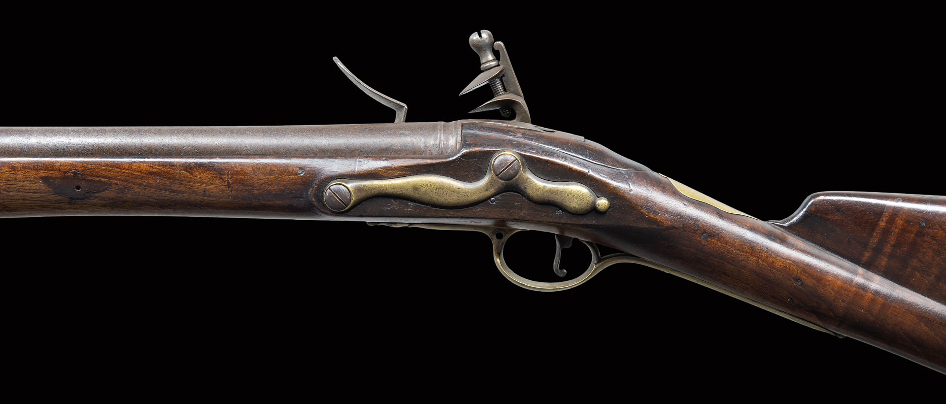 In 1745, with the 2nd Jacobite uprising, the city of York became concerned that they would be invaded from the North and as a precaution contracted with gunmaker Robert Watkin to make a number of muskets. Quite a few of these are known to collectors today and this good example is of 1742 Long Land pattern with 45-5/8″ round barrel. There are indecipherable proof marks at breech end. Lock of 1730 pattern with inset rounded pan and unbridled frizzen has simple heart shaped finial to feather spring. Center of plate is engraved “R. Watkins”. Robust stock of dense European walnut extends to within 4″ of muzzle with brass cap and is mounted with 1742 pattern brass furniture. Wooden ramrod has brass tip. No markings are noted on brass. Left side of butt is stamped “Y+C” “149”. It is not know if this is an indication of the number produced or if it was a rack or inventory number.