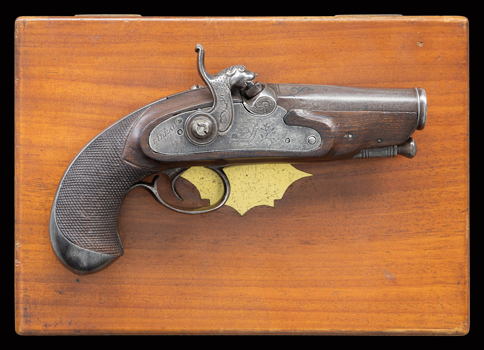 3″ octagon to round barrel with cannon type muzzle has silver scroll inlay around maker’s name “V.G.W.” “LIBEAU” on top flat (known to be working in New Orleans in 1847). Front spring lock with fancy full relief carved dog’s head hammer is engraved with bird feeding on a twig in front of hammer; “LIBEAU” is at rear. American walnut stock with checkered bag grip is steel mounted. Backstrap is engraved “NEW ORLEANS 1837”. Trigger guard has spear finial and sideplate has scrolled extension at rear. A steel ram rod with button head is held by turned steel thimble. UNATTACHED ACCESSORIES: pistol is housed in small walnut jewelry case with brass trim; lined in purple velvet. Also included is an information card.