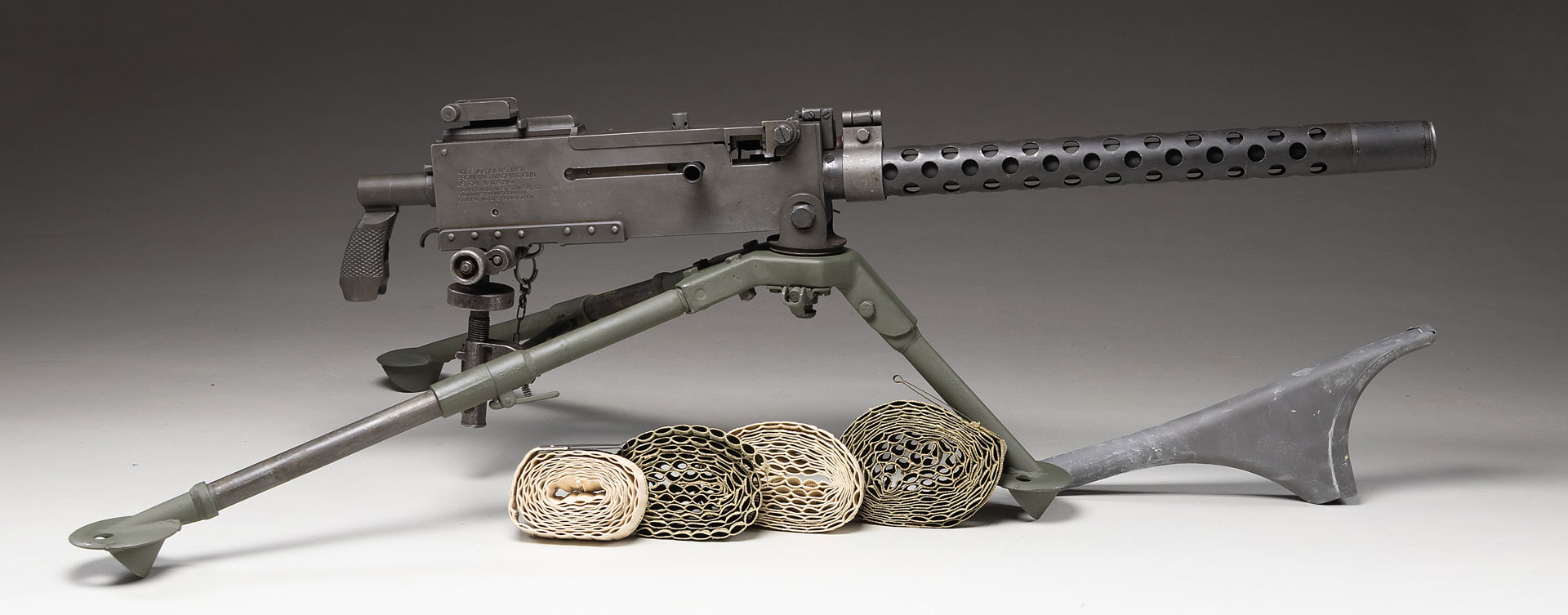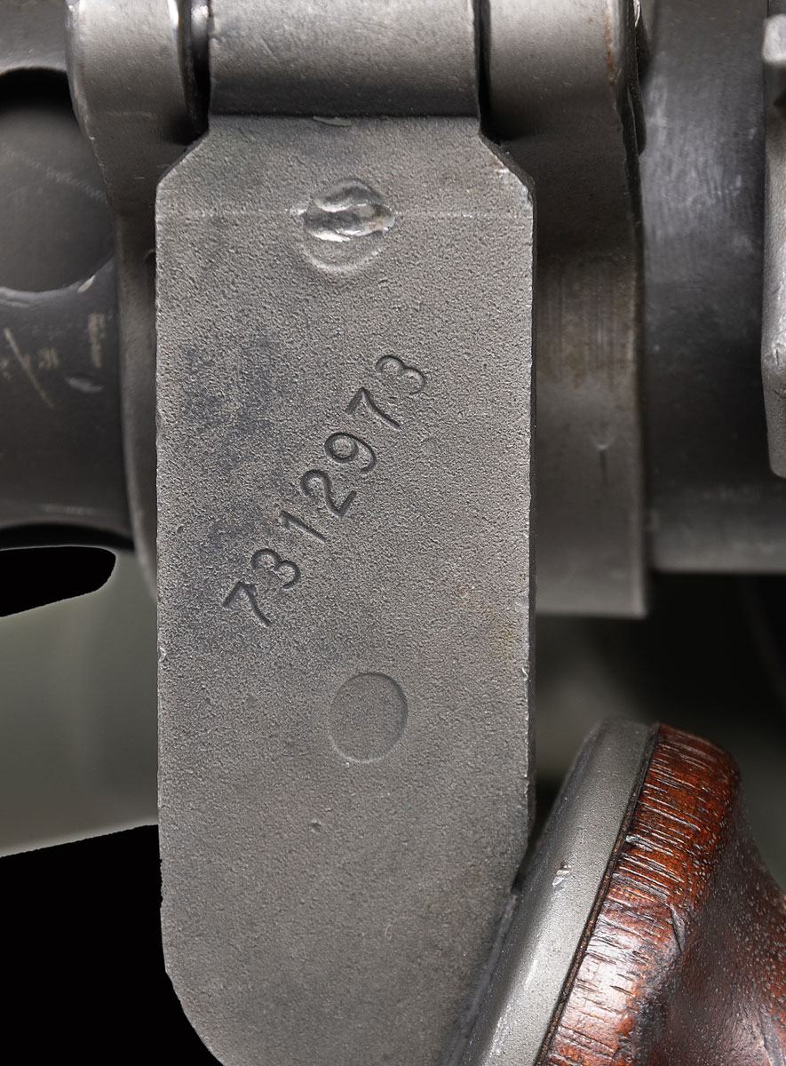 Flip-up blade front sight. Ladder “30M1” marked rear sight. The air cooled 1919 machine gun is one of the most iconic machine guns in history with a very long service life seeing use in WW2, Korea, Vietnam, varied Middle Eastern conflicts among many others. Registration paperwork lists model as 1919A6. Gun has features of box M1919A4 & A6 with A6 style carry handle & A4 style tripod. Parts appear to be a mix of USGI & Israeli. Right sideplate has “US INSP/BROWNING MACHINE GUN/US CAL. 30 M1919A4/MAN’FD BY DLO MFG, STAMFORD, CT/SAGINAW STEERING GEAR DIV/GENERAL MOTORS CORPORATION”. Bolt is marked “7.62” & is likely Israeli. Parkerized finish. Hardwood carry handle. UNATTACHED ACCESSORIES: 1919A6 buttstock, 4 varied cloth belts, tripod & T&E unit. NATIONAL FIREARMS ACT MG REQUIRING BATF TRANSFER BEFORE TAKING POSSESSION. FULLY TRANSFERABLE. STATUS: MODERN CLASS III.