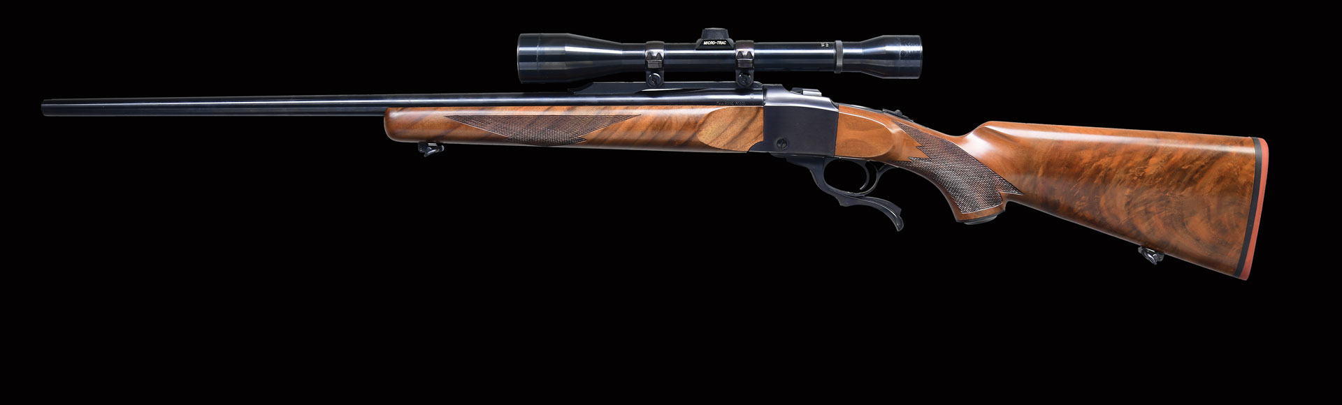1978 as Model 01315. This example features a blued finish on the 26-inch round barrel and receiver; barrel has warning markings & quarter rib. The rifle boasts a finely checkered walnut forearm and a checkered walnut pistol grip buttstock with a rubber pad. UNATTACHED ACCESSORIES: Weaver K6-1 scope with duplex reticle on Ruger rings. STATUS: MODERN