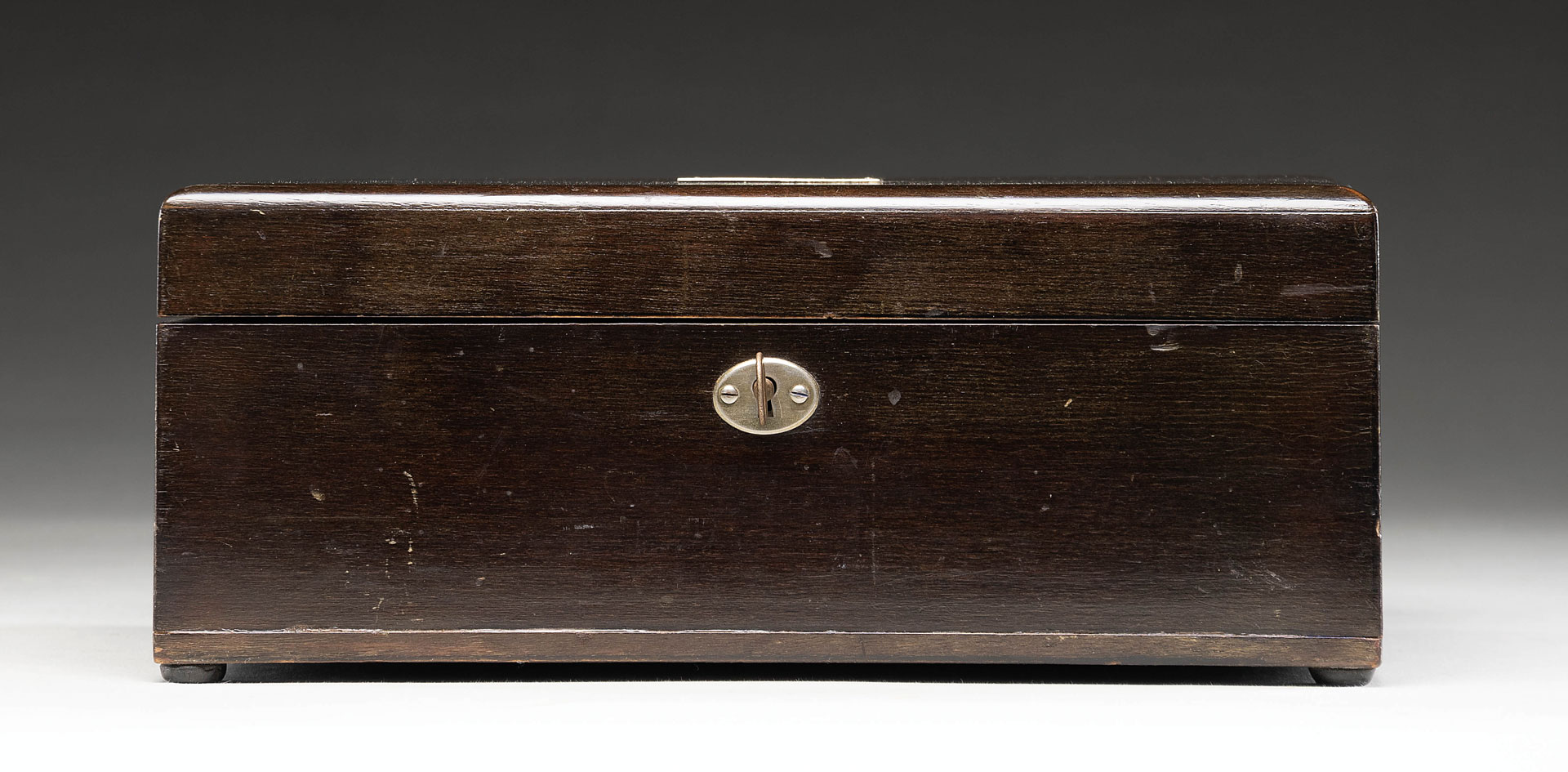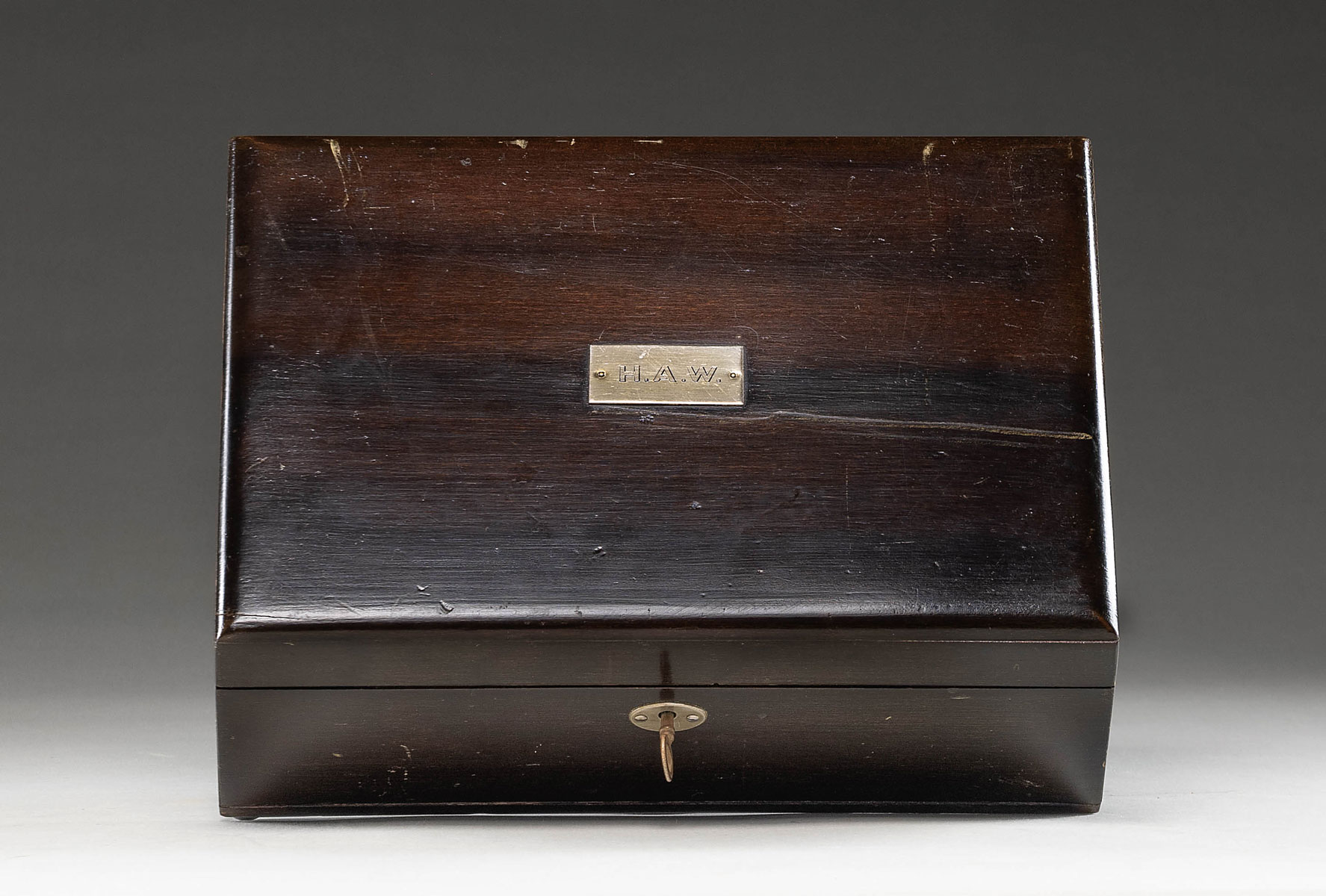 12″ x 8″ x 5″ mahogany box with key lock. German silver rectangle on top engraved “H.A.W.”. Interior is lined in cedar and has cork in lid. Box has two lift out trays. Bottom compartment and each tray contains over 60 flies of various patterns which appear to be contemporary with the box. About 15 flies are afixed to cork in lid. PROVENANCE: From the Private Collection of Berrien Moore III.