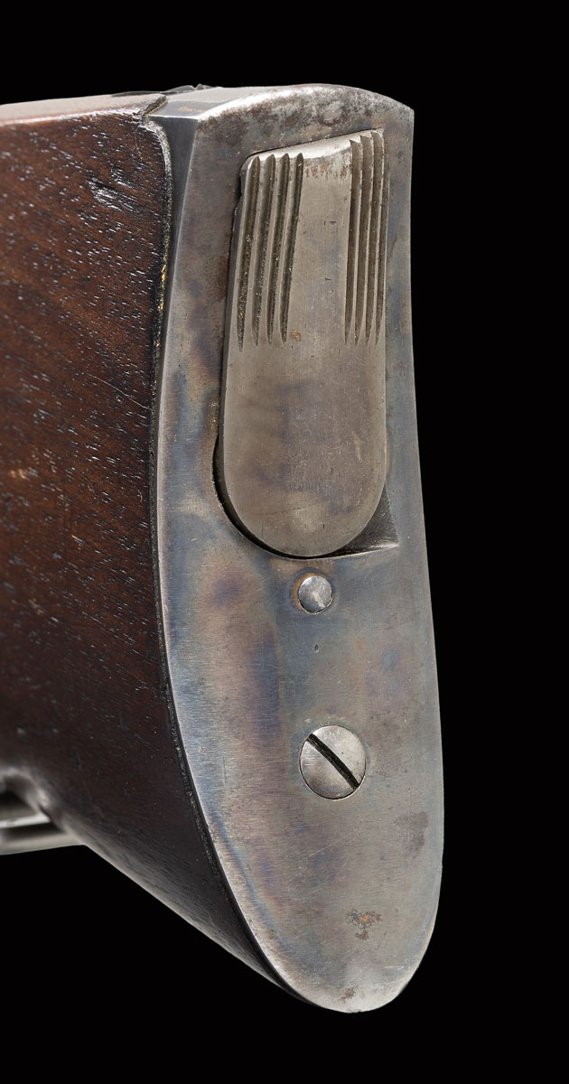 Standard configuration of rifle made 1865-1867. 30″ 6-land & groove rifled barrel stamped “M 1865”, 4 line address “SPENCER REPEATING / RIFLE CO. BOSTON / PAT’D MARCH 6 1860” stamped on breech. This is a very fine survivor retaining most of its original finish and shows little if any use. PROVENANCE: Estate Collection of John “Jack” Dhooghe. STATUS: ANTIQUE.