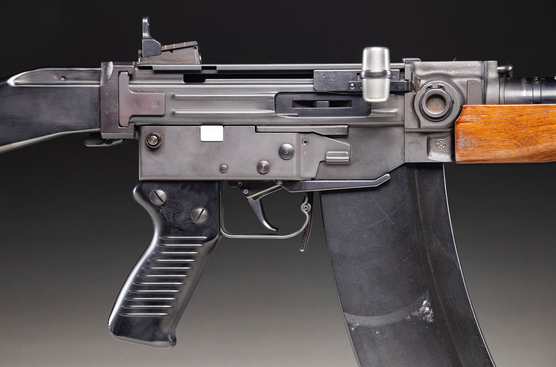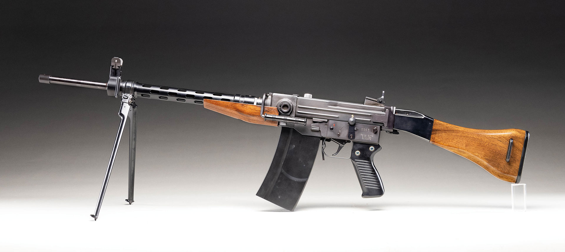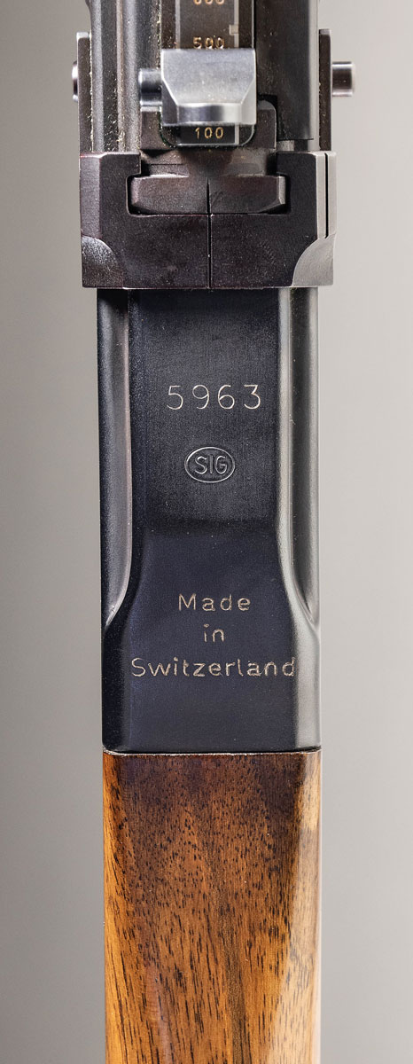 The SIG AMT (American Match Target) is a semiautomatic variant of the SIG Model 510-4, machine gun, one of 1440 imported into the United States between 1969-1978. This particular example was imported by Benet Arms of San Fransisco, California. Similar in legal history to the “G” Series” FAL, in 1969, a very small number of 510-4 semiautomatic rifles were built on machine gun receivers and finished w/ semiautomatic parts before being imported into the United States. The BATFE approved their importation, so they do not fall under NFA restrictions, but future imports were built on semiautomatic specific receivers & modified for USA “Sporting Purpose” criteria by turning down the grenade rings on the barrel & eliminating the bayonet lug. In the 1970s these rifles were priced far more expensive than comparable rifles, & the low import numbers combined w/ the high original price has made these some of the rarest & most desirable military-style offerings in the United States. The operating system consists of a closed-bolt, delayed blowback mechanism utilizing twin locking rollers. It is charged by utilizing a non-reciprocating op-rod, w/ a beer-keg shaped charging handle, protruding from the right side. The safety / selector is located on the left side of the receiver w/ a clever, folding winter trigger mechanism located on the right side, parallel w/ the magazine well. Matte black finish on all exposed metal parts. Protected post front sight. Elevation adjustable rear peep sight graduated from 100 to 600 meters. Folding bipod mounted just rear of front sight block rotates for storage above the 8″ ventilated barrel shroud, out of the way, not interfering w/ operation. Folding carry handle rests on left side of receiver. Beautiful hardwood 6″ forend w/ matching wood shoulder stock. Left side sling swivels. MAGS: 1 steel 30 rd. STATUS: MODERN.