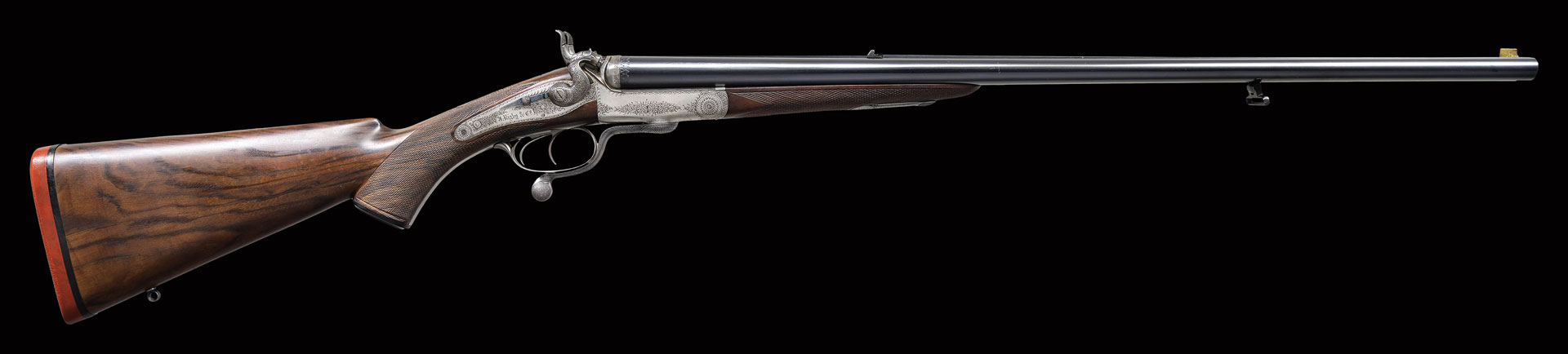 This “best” quality rifle was delivered in January of 1882 (factory letter) in time for Booth’s much anticipated American hunting trip. It has 26″ dovetailed steel barrels fitted with slightly raised file cut rib with extension. Rifle is sighted with one standing one folding express rear and tall blade brass front sights. Rear portion of rib with scroll engraving is inscribed in Gothic script “John Rigby & Co Dublin & London”. Barrel flats are stamped with London black powder proofs, S# and Rigby “RR” trademark. Bottoms of barrels are stamped “TB” (Thomas Bissell). Round bodied Jones under lever action fitted with penninsula back spring non-rebounding locks having stout serpintine hammers and back sliding safetys, has breech face monogram “TB” (Thomas Bissell made a good many of Rigby’s rifles and guns, his S# “1185” is stamped above monogram). Action and lockplates are engraved with about 80% coverage very nicely cut shaded scroll within scroll borders. “J. Rigby & Co” is on each lockplate. Fine quality replacement capped pistol grip buttstock made of nicely marbled European walnut measures 14-1/2″ over red “Old English” pad. Stock features hard rubber grip cap, right hand cheekpiece, well cut grip checkering and sling eye. Matching splinter forend is near fully checkered and is fitted with forward pivoting lever release engraved “Rigby’s Patent”. UNATTACHED ACCESSORIES: factory letter, book “BUFFALO BILL BOOZERS, BROTHELS AND BARE-KNUCKLE BRAWLERS, 3 old firing pins, 1 turned aluminum what’s-it, 9 brass cases and remnants of an old Illinois resident hunting license. STATUS: ANTIQUE.