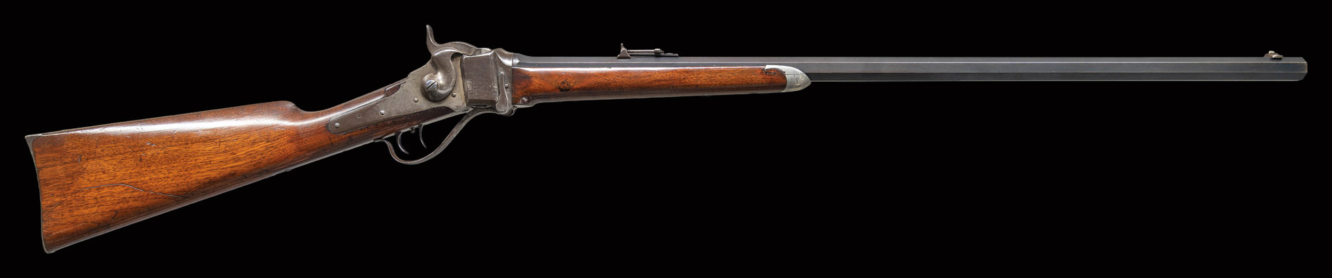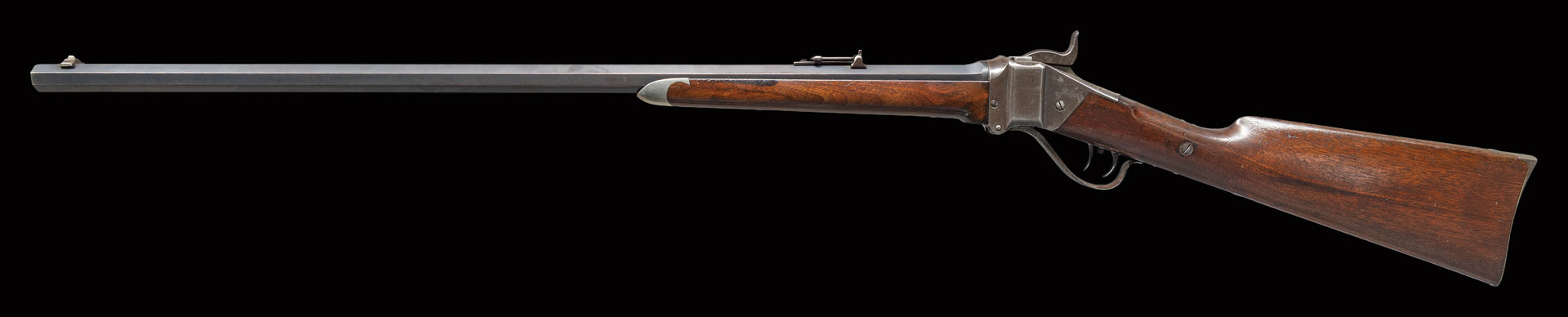 Bbl. 30″ octagon with Hartford address measuring 7/8″ across flats at the muzzle. Sporting front with Lawrence patent rear sight. Blue finished bbl. with case colored action. Double set triggers. Pewter tipped walnut forend and straight grip stock with rifle buttplate. Weight 9 lbs, 4.4 oz. A note with the rifle indicates a ship date of November 18,1875. PROVENANCE: The Esteemed Norm Greenberg Collection.