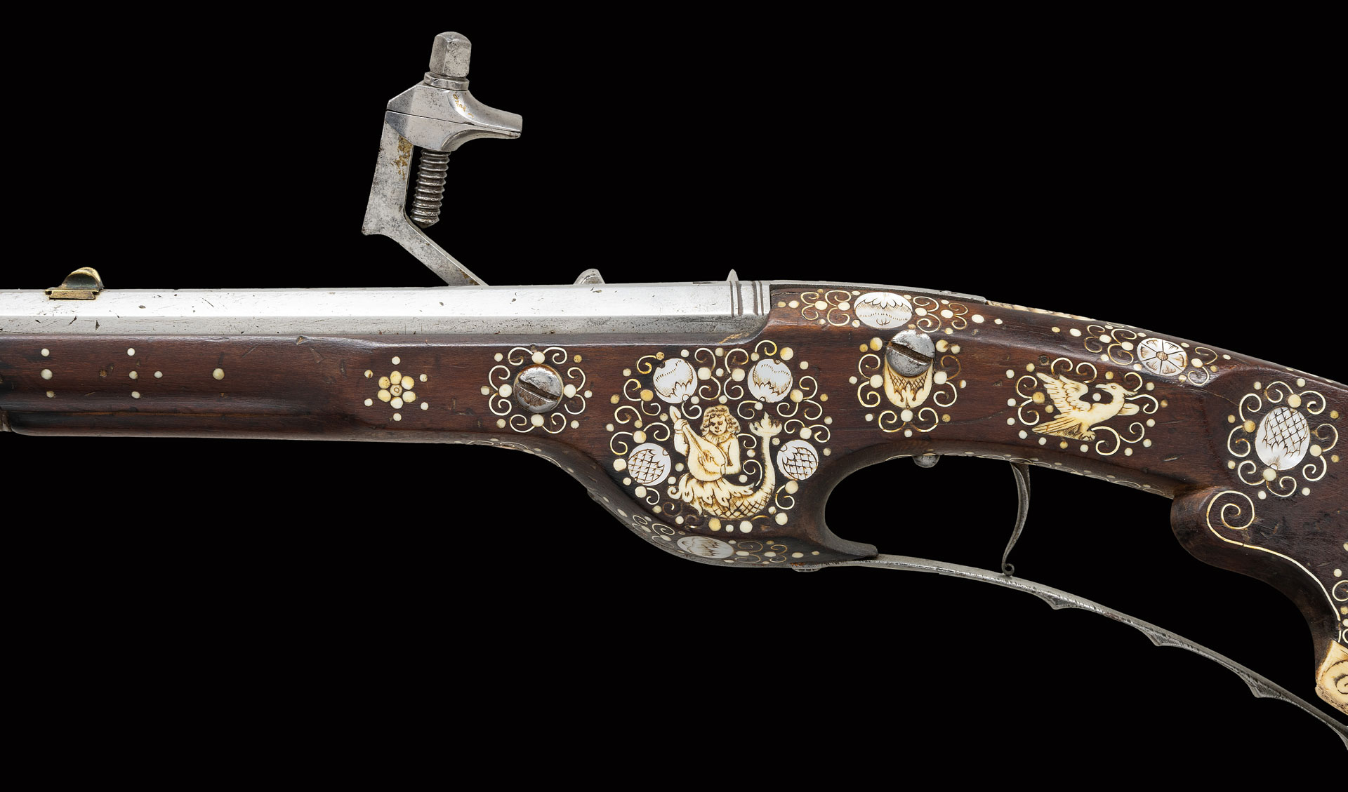 Essentially a pistol/carbine the petronel was meant to be used while on horseback and fired with the short butt resting on one’s chest. This example has 21″ half round half octagon barrel with brass rear sight and poincon at breech with the initials “HS”. Small size wheellock with sliding pan cover is undecorated. Newer European walnut stock extends to muzzle with scrimmed bone cap and is pinned to barrel. Down turned grip has bone buttplate and is built with small right hand cheekpiece. Stock is nicely embellished with intricate inlays of bone depicting mermaids, birds, griffins, dogs and an elephant surrounded by dots of decorated Mother of Pearl within small bone scroll background. A large inlay on face of cheekpiece depicts a knight on horseback slaying a dragon. A patchbox on right side has matching dovetailed cover. UNATTACHED ACCESSORIES: invoice for this piece dated 2013 including duty and shipping in the amount of about $24,000 Euros. STATUS: ANTIQUE.