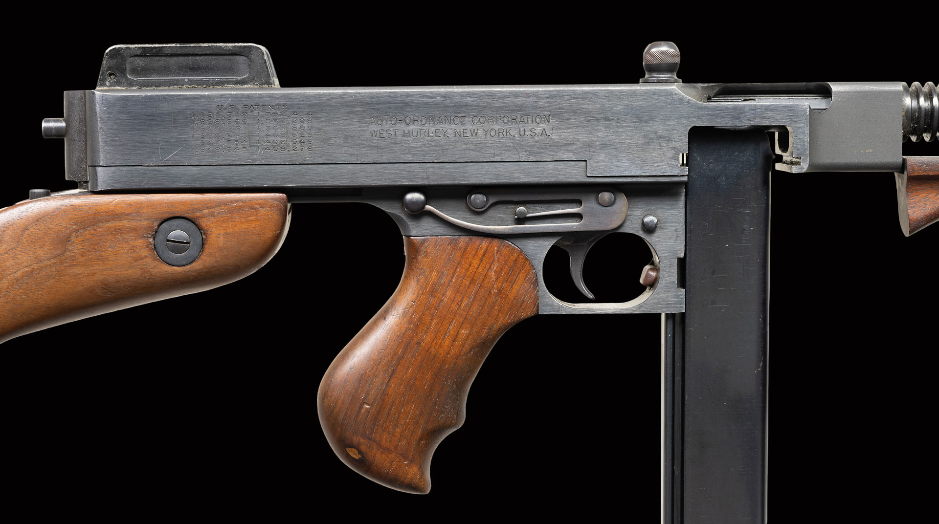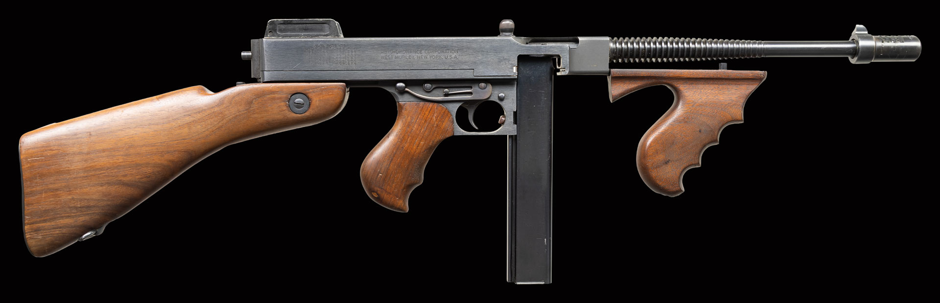 Bbl 10 1/2″ with Thompson trademarked Cutts compensator and cooling fins. Quality machined receiver with Thompson trademark on the top and 2 line West Hurly address on the right side. Dove tailed blade front sight. Folding ladder peep rear sight gradated to 600 yards. Walnut pistol grip, forearm & quick detachable buttstock. MAGS: 1-30 Round Seymour. PROVENANCE: Military Museum Collection of Shooters Outpost, Hooksett NH. NATIONAL FIREARMS ACT MG REQUIRING BATF TRANSFER BEFORE TAKING POSSESSION. FULLY TRANSFERABLE. STATUS: CURIO. CLASS III.