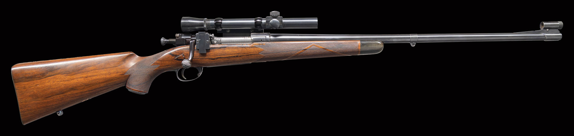 The 24″ reshaped military barrel is engraved “CAL. 30/06 R.G. OWEN-SAUQUOIT, N.Y. no 703” on top rear. Barrel is fitted with sleeved on front ramp with dovetailed hood holding gold bead front sight with flip-up night bead. Barrel is also fitted with sleeved on sling eye. 1903 Springfield action has been fitted with G&H side mount and Lyman 48 receiver sight (presently holding blank slide, original slide is in butt trap). Bolt has been lowered for scope use and has knob checkered and engraved. Bolt body is engine turned. Case hardened flag safety is fully checkered and silver inlaid “SAFE” and “READY”. Bottom metal has had floor plate hinged with button in trigger guard bow. Bow itself is nicely contoured and slimmed. Screw heads are engraved. Steel capped pistol grip stock made of nicely veined dense European walnut measures 13-7/8″ over very fancy checkered trap steel buttplate. Many uncheckered lines and scrolls run through pattern. Stock features classic Owen styling with arrowhead drop points, classically shaped beaded right hand shadow line cheekpiece, horn forend tip and toeline mounted with matching sling eye and gold shield engraved “W.W.” “U.S.A.”. Superb borderless checkering is of multi-point pattern at grip. Around forend, pattern is intersected with uncheckered lines. Rifle is mounted with Lyman Alaskan 2.5X scope with crosshair and post reticle in G&H alloy rings and slide. STATUS: CURIO.
