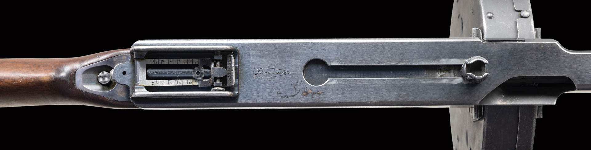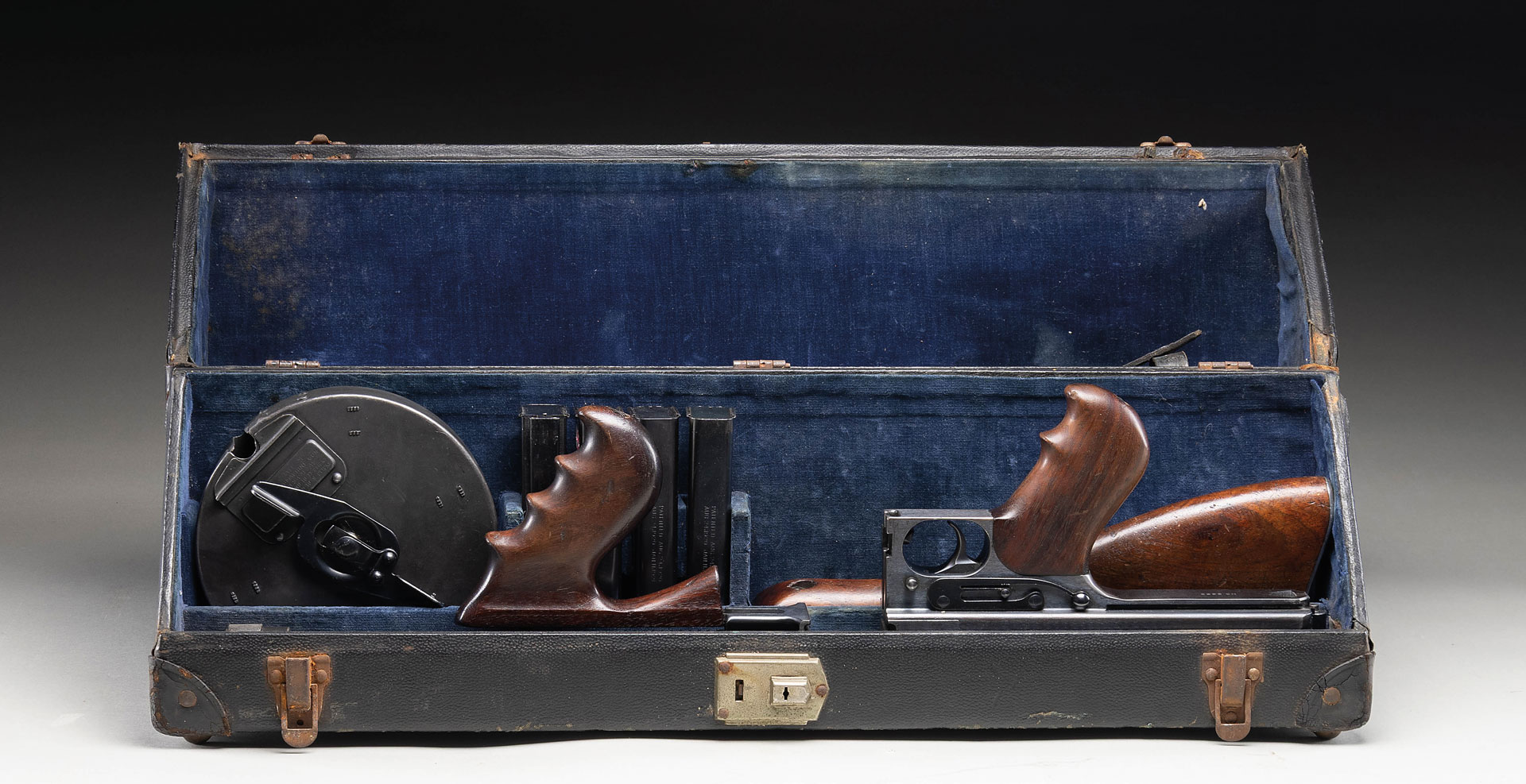 One of 14 iconic Colt Thompsons shipped to the Hall of Justice for the San Francisco Police Department in May of 1929. It was manufactured between 03/21-07/22. Between these dates 15,000 Thompson Machine Guns were manufactured by the Colt Firearms Corporation of Hartford, CT. Each gun manufactured was given the designation, and marked as the Model of 1921. In the mid 1920s Colt offered an enhanced version of the Model 1921, marketed as the 1921AC (such as this gun) which included the addition of a Cutts Compensator to help manage muzzle rise. This particular gun is listed in Gordon Herigstad’s book, “Colt Thompson Submachine Gun Serial Numbers and Histories” as being delivered to the Hall of Justice, c/o Property Clerks Office, Rm. 108, and noted as marked S.F.P.D. on the left side of the receiver, on page 710. This gun has a blued finish and the muzzle is terminated w/ unmarked Cutts compensator, integral w/ the front blade sight. Barrel is finned above the vertical foregrip. Receiver properly marked: “MODEL OF 1921.” w/ serial number, “THOMPSON SUBMACHINE GUN / CALIBRE .45 COLT AUTOMATIC COLT CARTRIDGE / MANUFACTURED BY / COLT’S PATENT FIRE ARMS MFG. CO. / HARTFORD, CONN. U.S.A.” on left. Fire control markings are “FULL / AUTO” & “SINGLE”. Above trigger it is stamped “S.F.P.D.” as indicated in the Colt Thompson book. Right side receiver markings include; “AUTO-ORDNANCE CORPORATION / NEW YORK U.S.A. & Patent block ending w/ DECEMBER 28, 1920” as well as “JHB”, acceptance stamp for John H. Barrett, Colt’s quality control inspector. Top of receiver marked w/ “Thompson” bullet logo forward of rear sight. Trigger frame stamped “NO 6889”, matching receiver serial number. Push button, detachable hardwood shoulder stock w/ metal butt plate & trap door. Trap door in shoulder stock still retains fiber cushion inside. Shoulder stock marked w/ small anchor at front, close to metal in quick detach assembly as used by the stock-maker Remington Arms. Gun has correct 1928 internals consisting of the weighted actuator w/ knurled cocking handle & bronze Blish lock. MAGS: (5 total) 1 parkerized “New York” 50 rd. L-Drum, drum marked “AUTO-ORDNANCE CORP NEW YORK N.Y., U.S.A. PATENTED JULY 27, 1920 DEC 7, 1920 & 4 steel 20 rd. stick mags. UNATTACHED ACCESSORIES: black folding case w/ blue velvet interior & cleaning rod. NATIONAL FIREARMS ACT MG REQUIRING BATF TRANSFER BEFORE TAKING POSSESSION. FULLY TRANSFERABLE. STATUS: CURIO CLASS III.