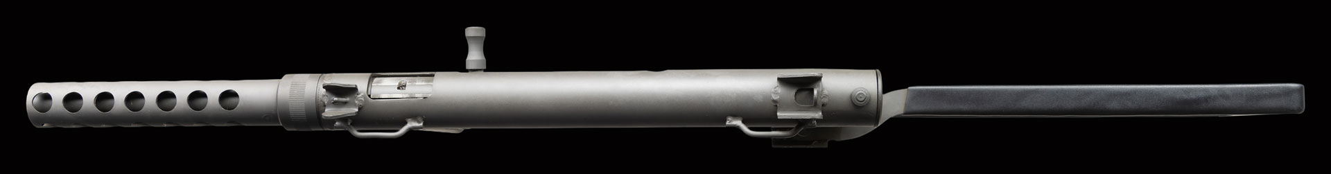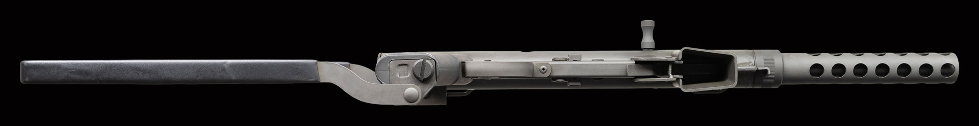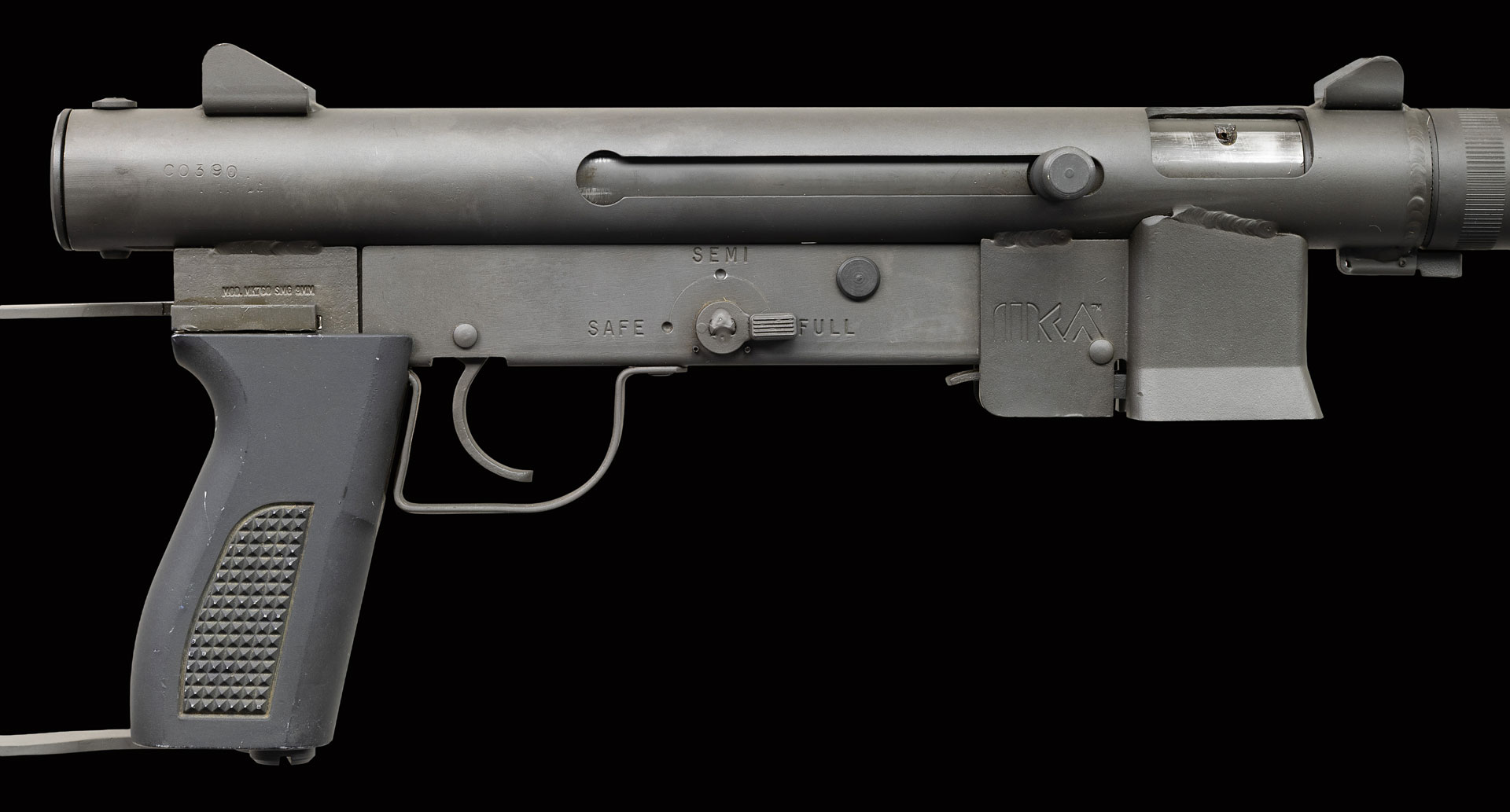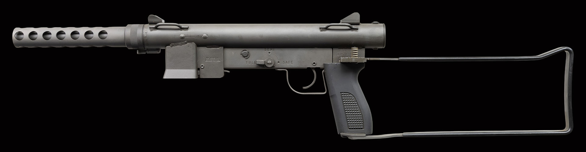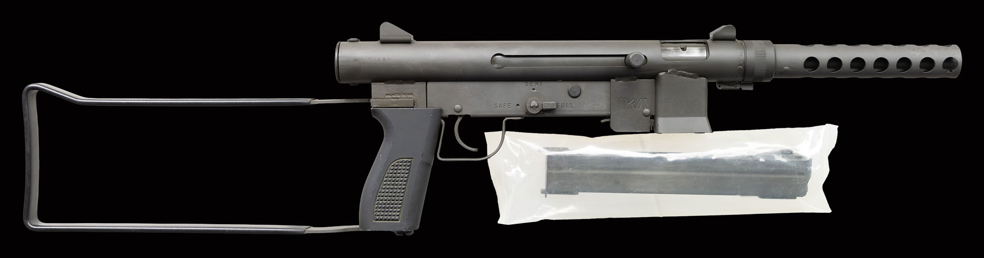 The MK Arms MK760 project started in the early 1980’s after acquiring M76 manufacturing rights from Smith & Wesson. It is yet another evolution of this extremely popular SMG design going back to the Swedish K. Protected post front sight and protected peep rear sight. Tube mounted swing swivels. Ambidextrous selector switch. Folding stock. Checkered pistol grip. MAGS: 1 -36 Round. NATIONAL FIREARMS ACT MG REQUIRING BATF TRANSFER BEFORE TAKING POSSESSION. FULLY TRANSFERABLE. PROVENANCE: Military Museum Collection of Shooters Outpost, Hooksett NH. STATUS: MODERN. CLASS III.