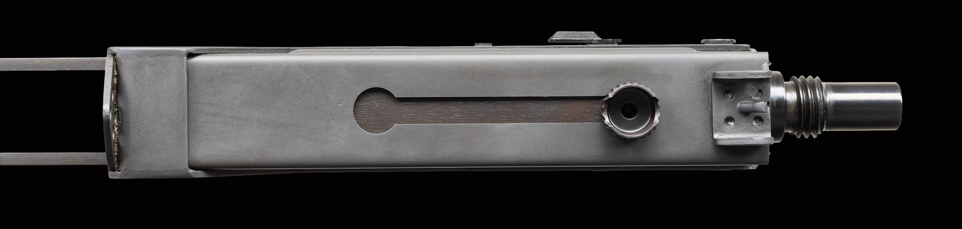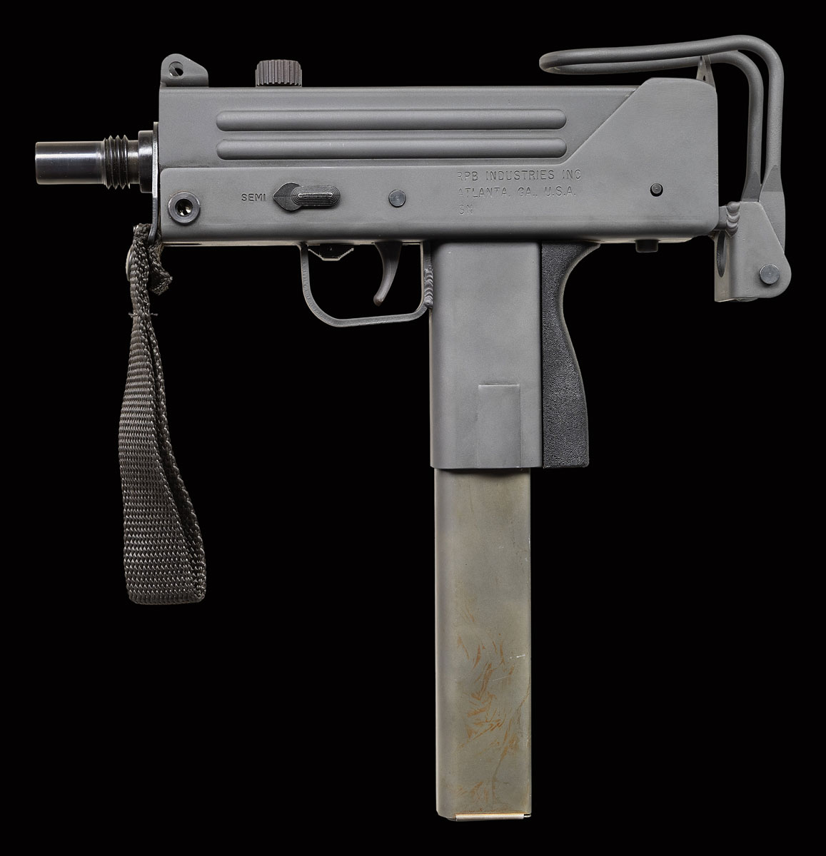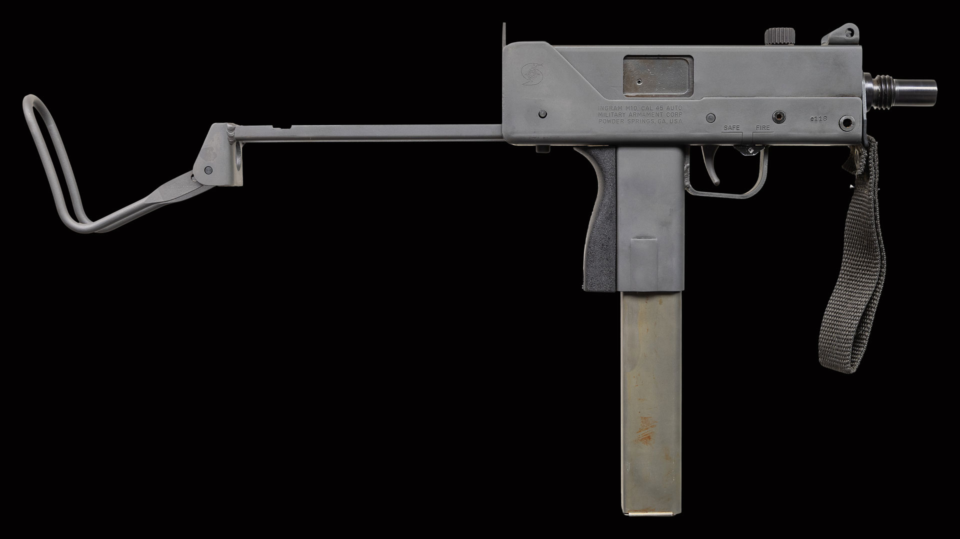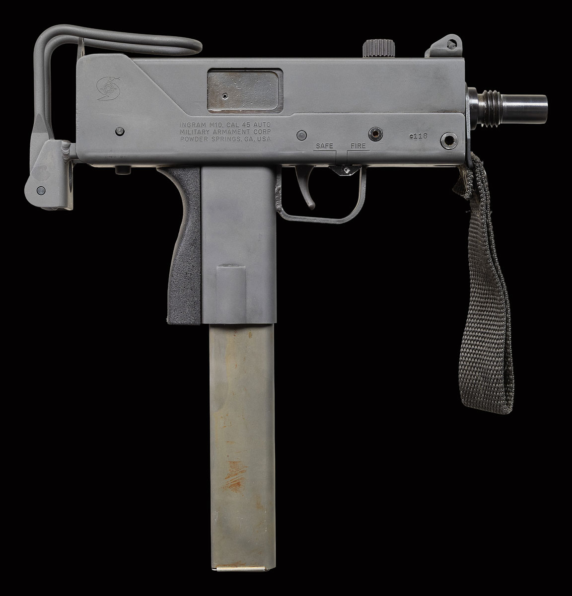 There are very few firearms that conjure up the imagination of the general public more than the mere mention of the MAC 10. The Ingram Model 10 was originally designed in 1964. It would become the 1st of many small simplistic SMGs to contrast the expensive & labor intensive earlier variants such as the Thompson & Reising M50. Ingram’s 2 basic guidelines while designing the Model 10 “simple & cheap” while remaining effective & reliable. Made famous mostly by Hollywood, the M10 had appearances on the silver screen & on television eventually earning the infamous title of “The Gun That Made The 80’s Roar” starting w/ John Wayne utilizing a suppressed 9mm M10 in the 1974 movie “McQ”. Post front sight with protected ears. Fixed rear peep sight. Marked ” Ingram M10,Cal 45 Auto/Military Armament Corp/ Powder Springs GA, USA” below ejection port. Left side semi/full selector. Safety on right side of trigger. Threaded barrel. Folding telescopic wire stock. Nylon forestrap. MAGS: 1-30 Round. NATIONAL FIREARMS ACT MG REQUIRING BATF TRANSFER BEFORE TAKING POSSESSION. FULLY TRANSFERABLE. PROVENANCE: Military Museum Collection of Shooters Outpost, Hooksett NH. STATUS: MODERN. CLASS III.