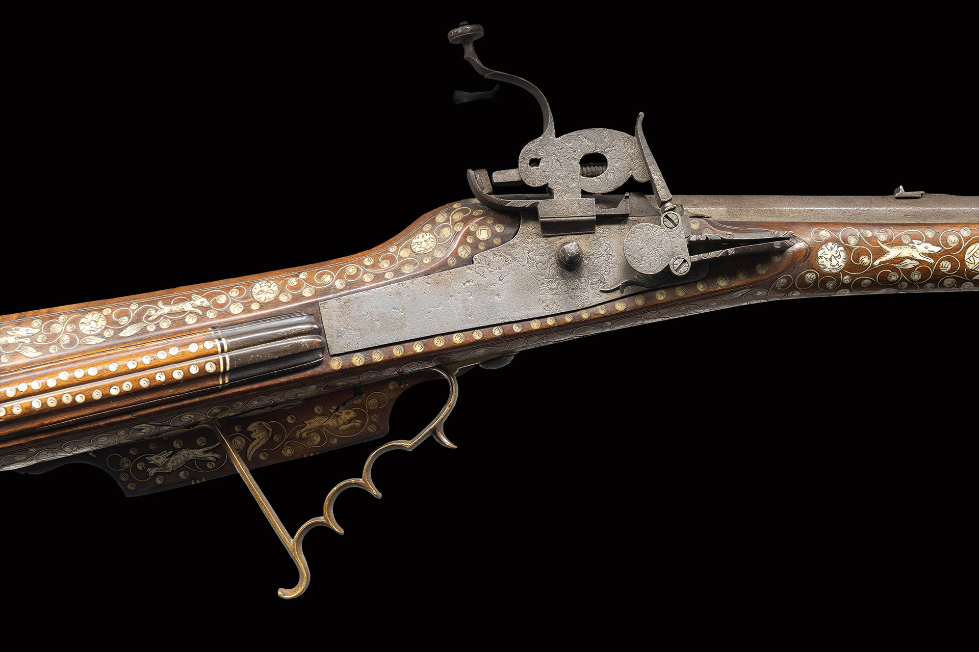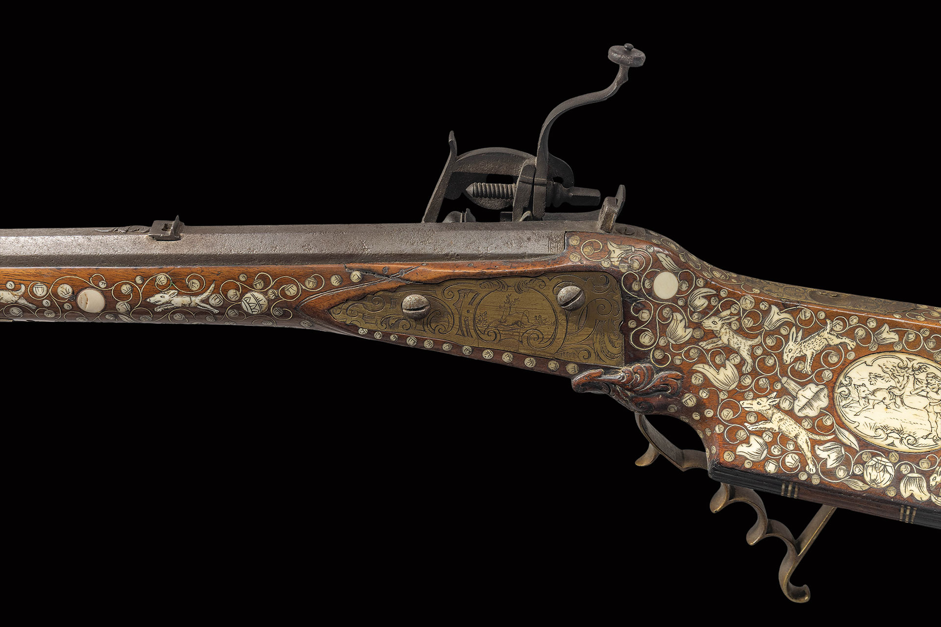 The 30-1/2″ deeply swamped unmarked octagon barrel is fitted with small “V” notch rear sight and steel bead front. Barrel tang is fitted with peep rear sight with adjustment dovetails. Wheel type lock with sliding pan cover and large pierced dog is engraved with nicely cut floral motifs and is signed “BZ” at top. Stock appears to be made of fruitwood and has some relief carved scrolls in front of classic right hand cheekpiece. Buttplate is of horn and there are some engraved brass inlays on top of comb. Side plate is brass as is trigger guard with finger grooves and spur. A fluted patchbox with horn accents at front and rear is on right butt. Stock is profusely decorated with a background of inlaid bone scrolls with floral accents which surround other bone inlays of dots and animals, mostly rabbits and dogs. On face of cheekpiece there is an oval bone inlay engraved with hunter and hound, while a family crest is on shield shaped inlay toward butt. PROVENANCE: Estate Collection of Nicholas Apergis. (01-27574/MGM)