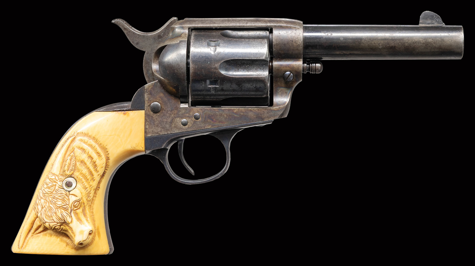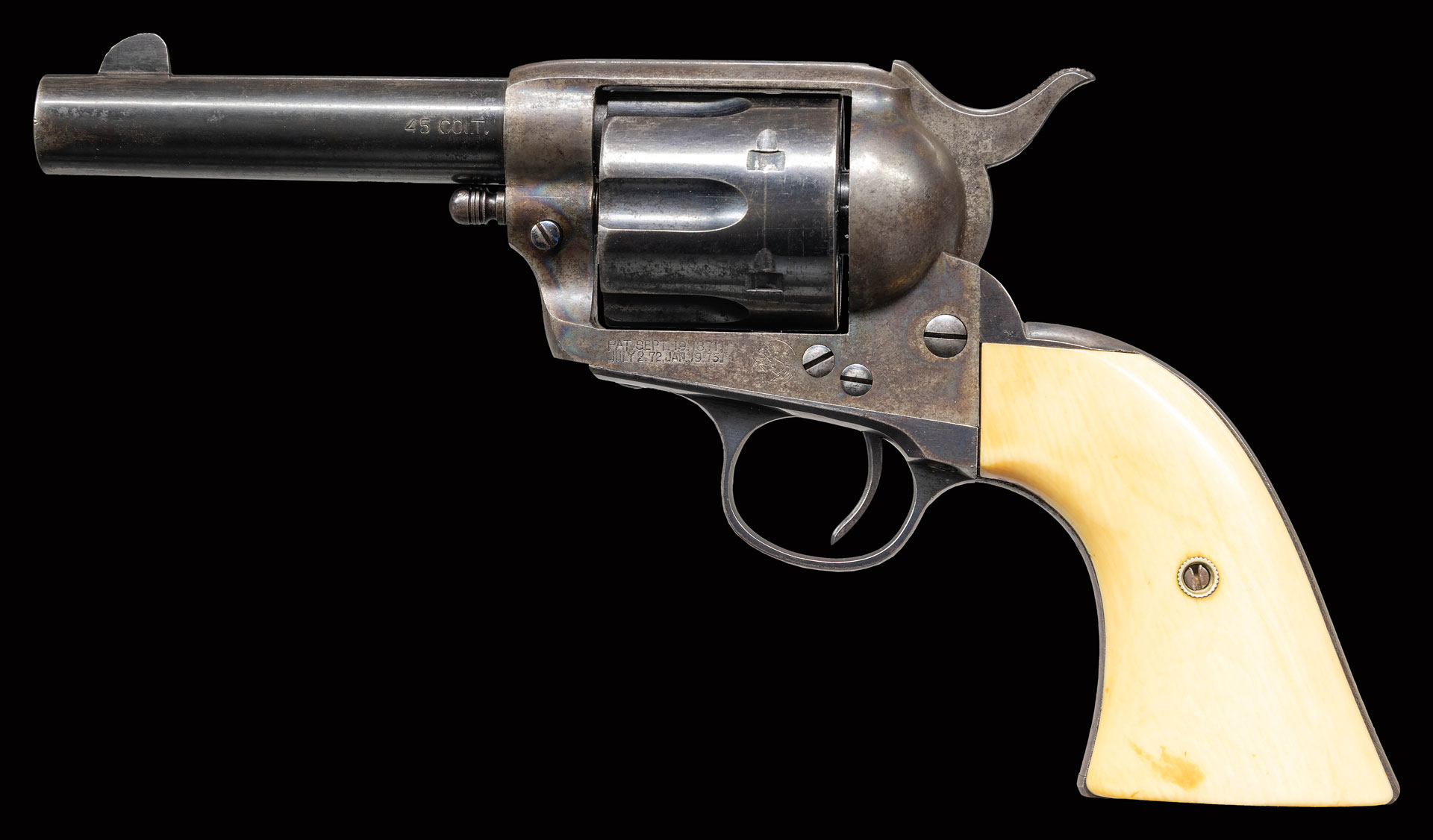 Bbl. 4″ ejectorless with blade front sight and 2 line bbl. address. Exceptionally rare and seldom seen with this degree of original finish. “THE OFFICIAL RECORD OF THE COLT SINGLE ACTION ARMY REVOLVER” By Don Wilkerson and Carol Wilkerson states “just under 600 ejector-less Single Action Army revolvers were produced in all calibers from 1882 to the 1930’s. Survey of serial numbers 1-164100 shows a total of 70 revolvers mfg. with a 4″ bbl. and blued finish. Proper 2 line bbl. address. Left side of frame has 2 line patent date and Rampant Colt in circle. Blued bbl, 6 shot fluted cyl. and grip frame. Case hardened frame & hammer. Replacement smooth white grips; right panel has raised relief carved steer head. UNATTACHED ACCESSORIES: Colt factory letter stating the following: COLT STOREKEEPER’S MODEL / Caliber: 45/c / Serial Number: 204829 / Barrel Length: 4″ / Finish: Blue / Type of Stocks: Checkered Ivory / Sold to: H.L. Dyer / Address: Unavailable / Shipped to: Simmon’s Hardware Company / Address: St. Louis, Missouri / Date of Shipment: July 29, 1903 / Number of Same Type Guns in Shipment: 1”. STATUS: CURIO.