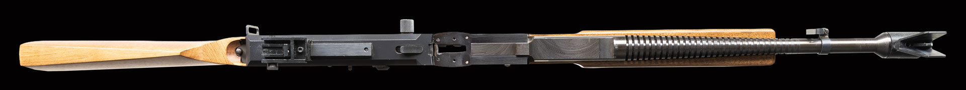 With its enormous cyclic rate, combined with the large capacity magazines & the inexpensive cost of ammunition, the American 180 is one of the most popular guns on any firing line. It is an open bolt, select fire 22 LR buzz saw that typically feeds from a 176 rd., 3 tiered metal circular mag. mounted on top of the receiver. Fixed blade protected front sight. Adjustable rear peep sight. Thinned Barrel. Machined receiver marked on the bottom “American Arms into SLCUT/ American 180 M-2”. Smooth walnut finger groove three piece stock set. MAGS: 1-Drum. PROVENANCE: Military Museum Collection of Shooters Outpost, Hooksett NH. NATIONAL FIREARMS ACT MG REQUIRING BATF TRANSFER BEFORE TAKING POSSESSION. FULLY TRANSFERABLE. STATUS: MODERN. CLASS III.