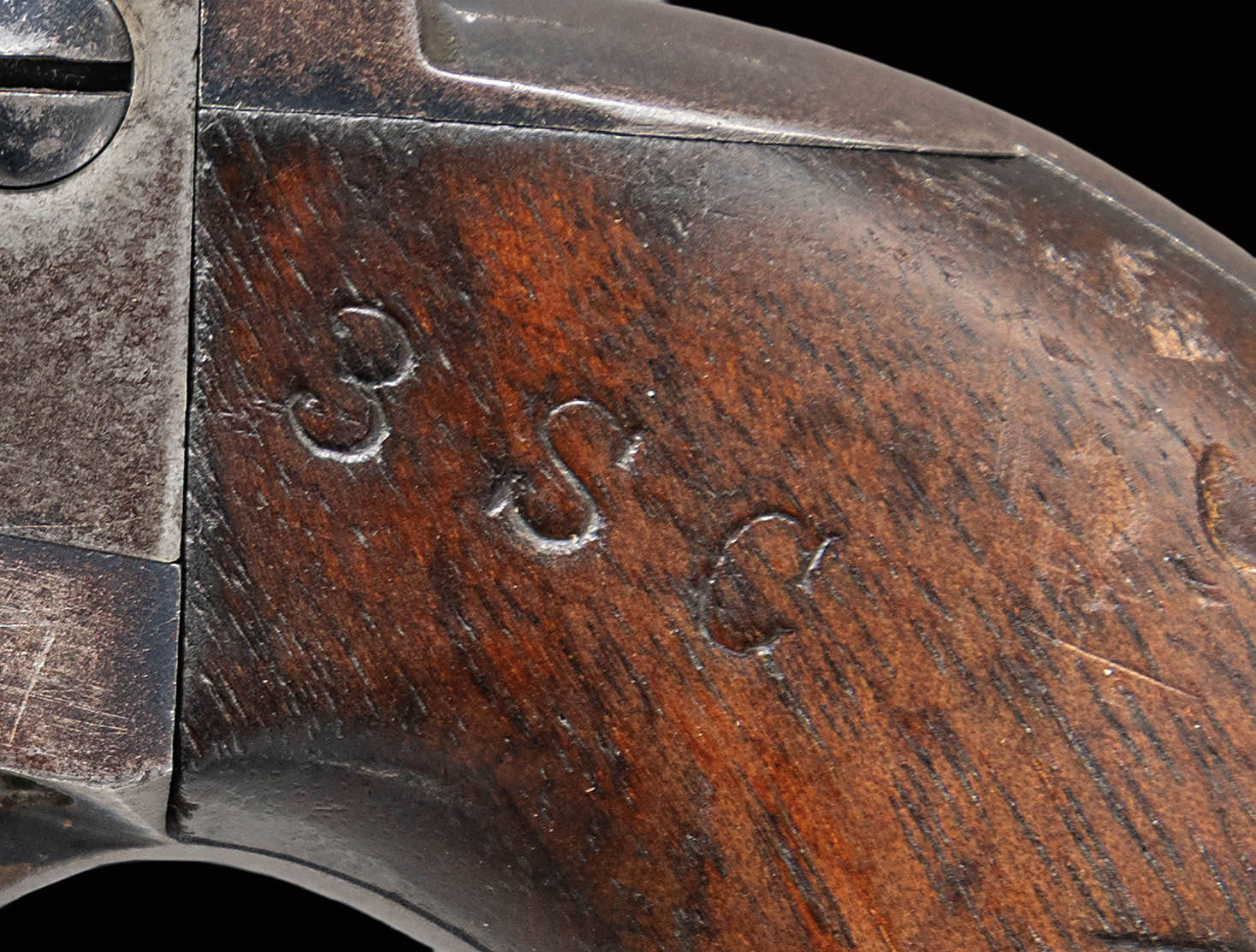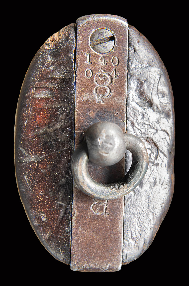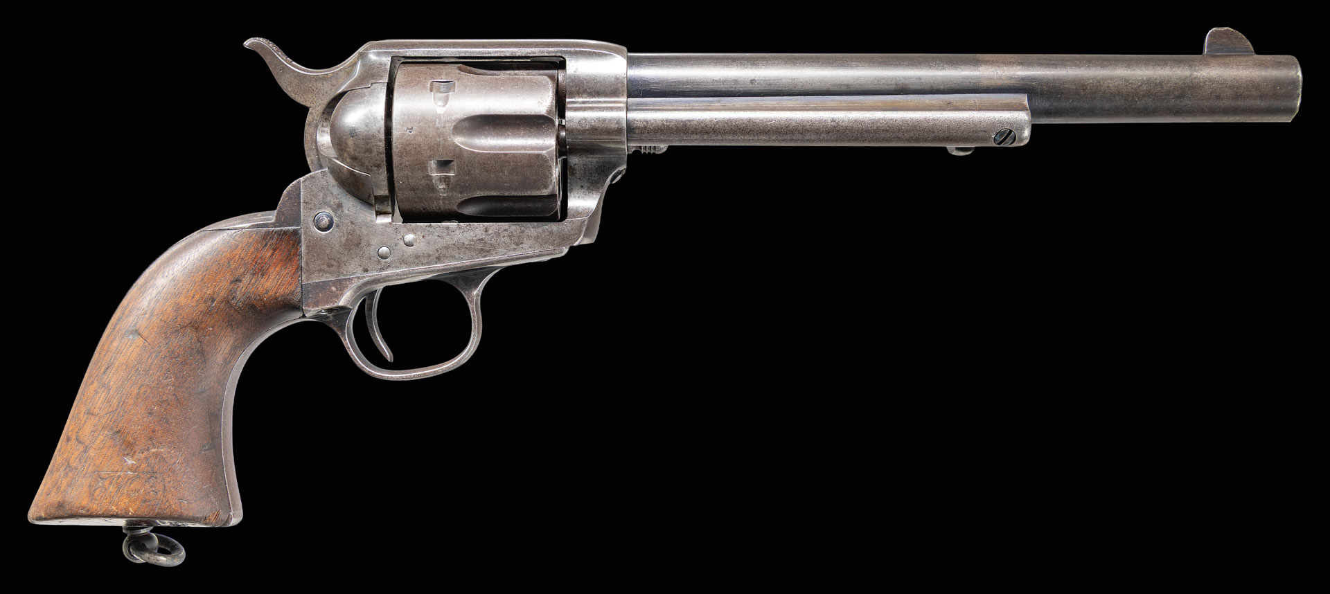 Listed by serial number on page 129 of “COLT CAVALRY & ARTILLERY REVOLVER…A CONTINUING STUDY” by Kopec & Fenn, this revolver is one of only 15 identified by the authors as it is likely that most were refurbished and re-issued as Artillery revolvers. Page 127 states “There is, however, one group of Cavalry revolvers which shows physical evidence of being part of the “Pre 1895″ group of New York Militia revolvers. Most of these revolvers were part of the very last group of U.S. Cavalry revolvers shipped from Colt. These revolvers left Colt on April 29, 1891”. This revolver was part of that shipment. Page 127 further states “These were part of the lot of seventy such revolvers which then were issued to the state of New York on January 26, 1893”. Page 129 notes that most of these revolvers were fitted with a lanyard ring likely by the State Armorer rather than by Springfield. Left side of frame marked “US”. Revolver is stocked with original “1891” dated grips and display “S.E.B.” cartouche. “RAC” cartouche on butt not visible due to wear & dents. This is another rare feature as it is additionally noted on page 129 that most N.Y. Militia revolvers were fitted with refinished grips, Left side of grip marked “3SC” with additional illegible marking above date stamp. Bottom of grip frame marked with “8” and “B”. Bottom of bbl, frame & cyl marked “RAC”. Bbl. and cyl. additionally marked with “P” proof. “K” proof marked on butt, end of ejector housing, in hammer slot and bottom of trigger guard frame below serial number. Hammer slot also marked “O”. Matching numbers on frame, butt, trigger guard frame & bbl. (0064). Cyl numbered “6348”. UNATTACHED ACCESSORIES: Colt factory letter stating the following: Serial Number: 140064 / Barrel Length: Not Listed / Finish: Blue / Type of Stocks: Not Listed / Sold To: United States Governemnt . Delivered ToL U.S. Government Inspector / Address: located at the Colt plant / Number of Same Type Guns in Shipment: 250″. STATUS: ANTIQUE.