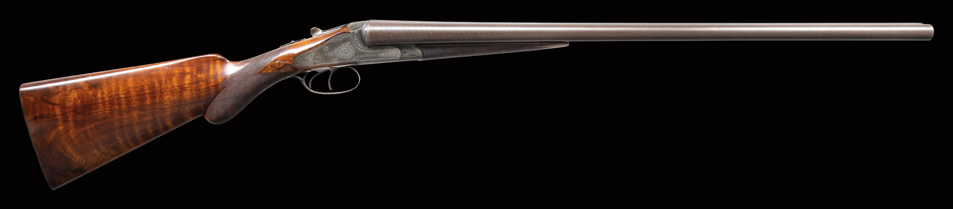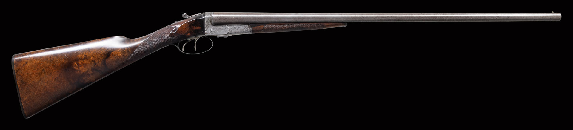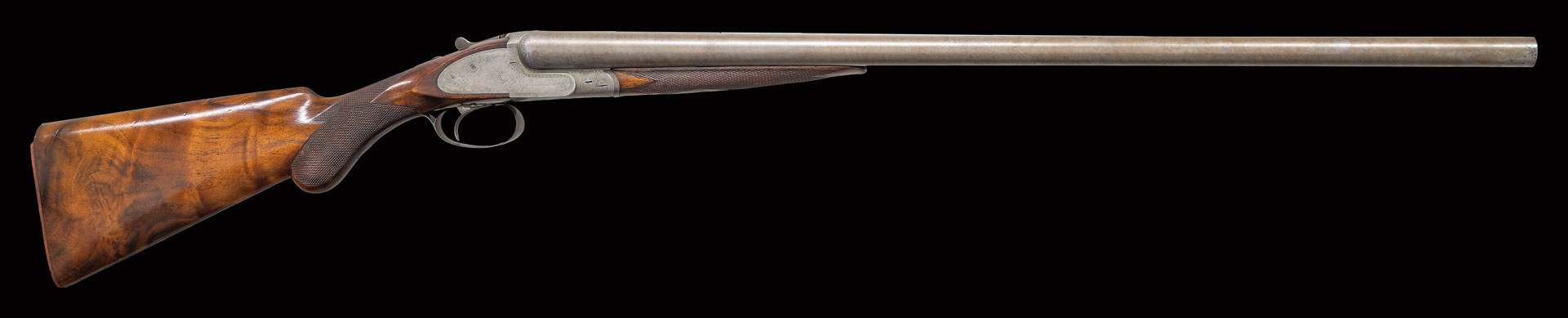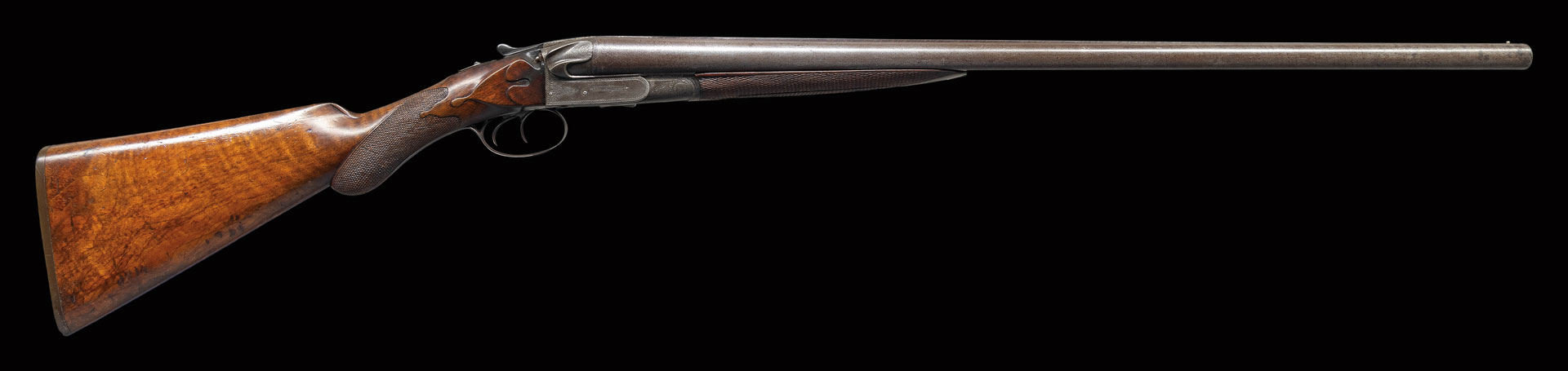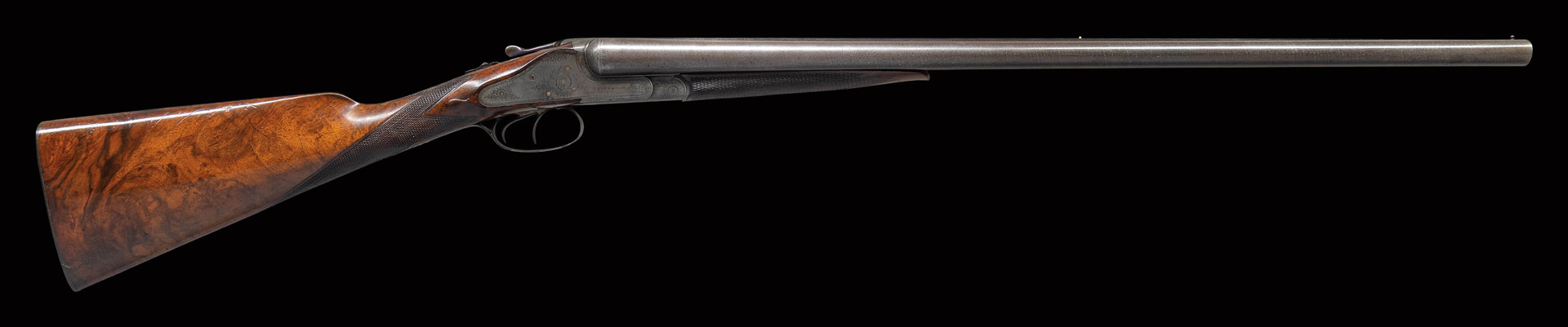 David Kirkwood was born in Edinburgh, Scotland in 1841 and apprenticed for seven years as an action filer with Mortimer of the same city. On completing his apprenticeship, he worked for a while for a German gunmaker named Weber. He returned to England and spent some time with Whitworth of Manchester. He started business for himself in Birmingham for a short time. He came to America in 1873 and worked at American Arms Company, Boston; makers of the high-quality Fox patent side swing guns. He had a short partnership with Henry Mortimer who marked their guns “Mortimer & Kirkwood”. Their partnership dissolved in 1880 and David continued to build fine guns until his death in 1897. As all of his guns were completely handmade, each is unique. All show a very high quality of workmanship and attention to detail. He used high quality barrel tubes and his stock wood was invariably dense European walnut, some with very fine figure. An almost universal feature of his guns was his square shouldered dolls head rib extension similar to that used by Lefever, which was fastened by a sliding bolt actuated by a camming top lever similar to that used by Westley Richards. On his early guns this system was the only lock-up for the action. It was later combined with Purdey type under bolts.