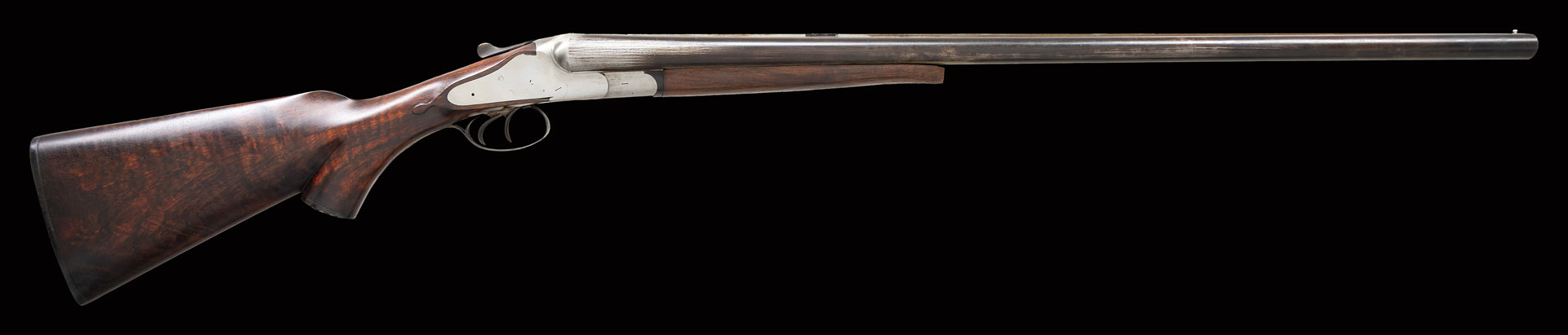 It has been written that Kirkwood’s serial #s started CA 1882 at about 900, and ended CA 1897 at about 1390. A pair of 10 bores (S#1425 & S#1426), in this auction were made by David but finished after his death by Kirkwood Brothers.