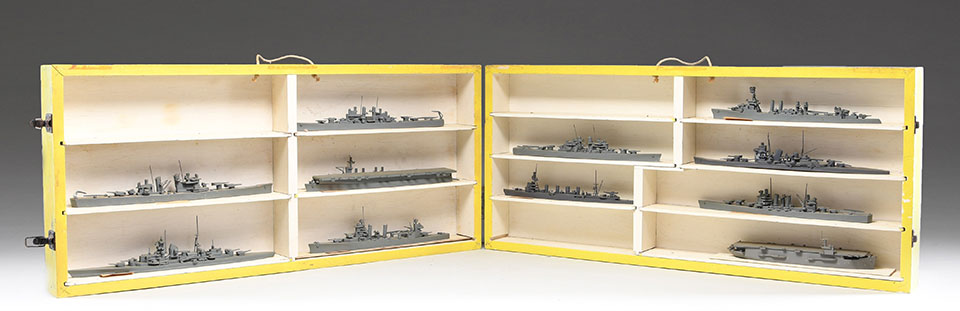 11 WWII NAVAL SHIP IDENTIFICATION MODELS IN THIER ORIGINAL DIVIDED WOODEN CASE
